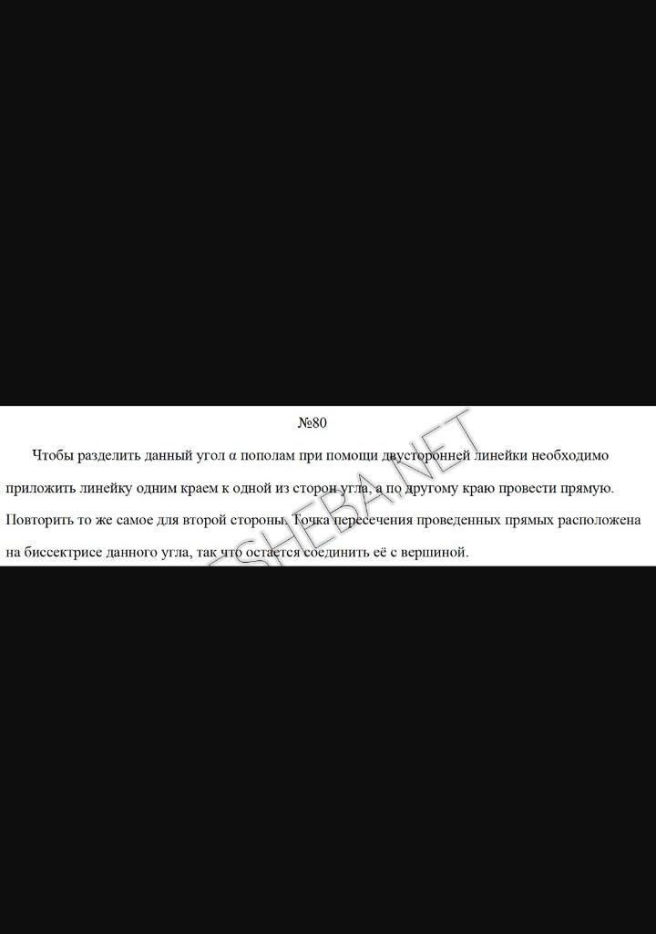 Похожим способом делят пополам отрезок. Проводят две окружности с центрами в концах отрезка, радиус окружности больше половины. Через 2 точки пересечения окружностей строят прямую, она делит отрезок на 2 половины.