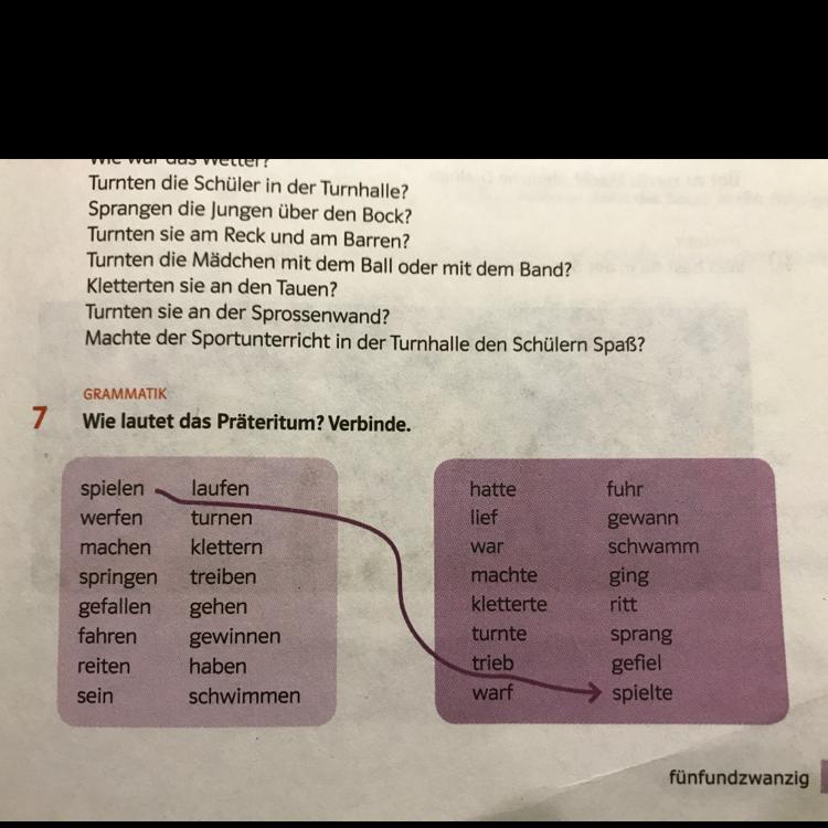 werfen-warf,machen-machte,springen-sprang, gefallen- gefiel, fahren-fuhr, reiten- ritt, sein-war, laufen-lief, turnen-turnte, klettern-kletterte, treiben-trieb,gehen- ging, gewinnen-gewann, haben-hatte, schwimmen-schwamm