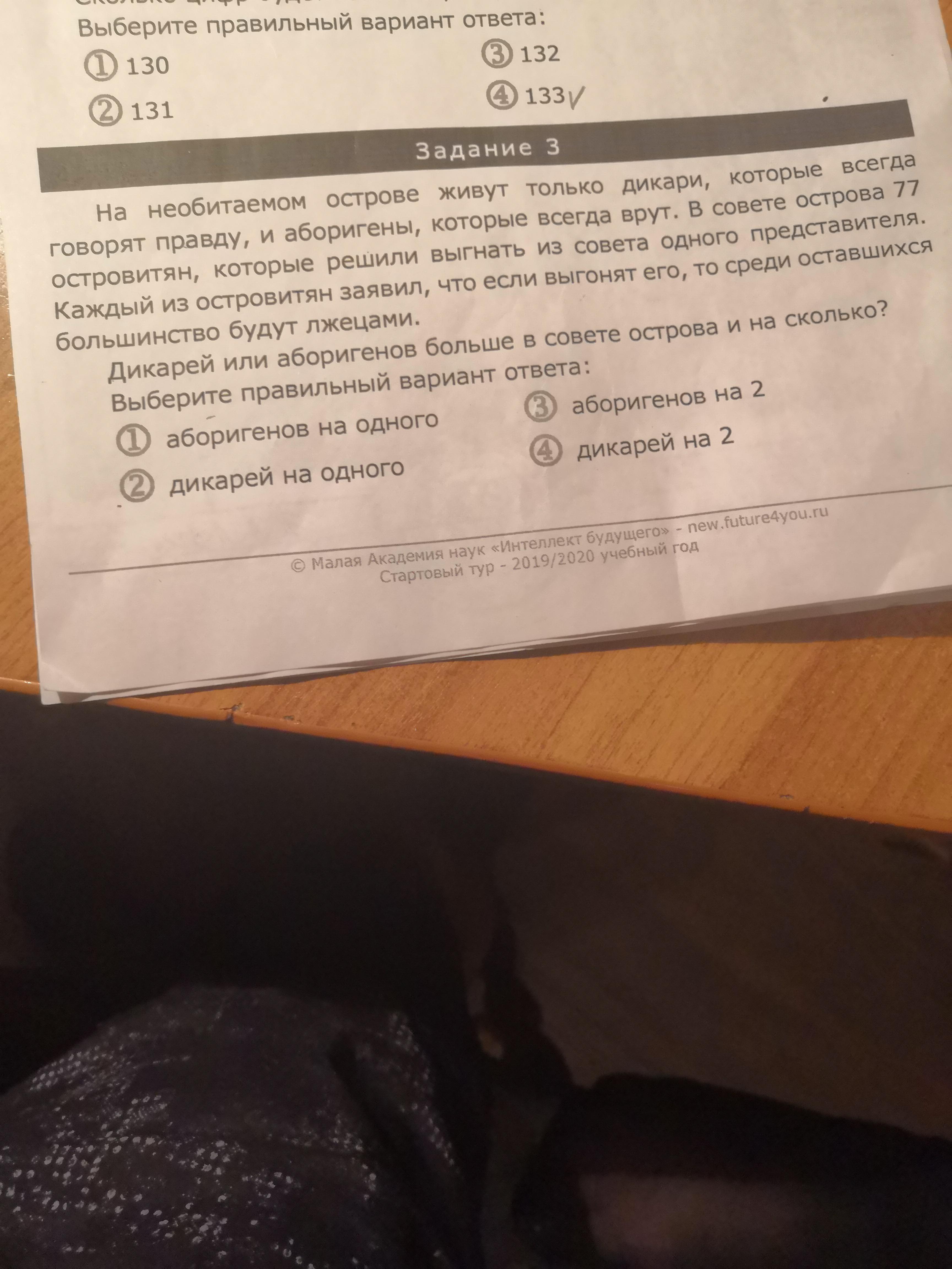 Если аборигены лгут, а дикари говорят правду, то если аборигены говорят, что лжецов останется больше, то на самом деле меньше тех кто говорит правду. А раз дикари говорят тоже самое и не врут, значит аборигенов больше. Но так как 1 выгнали, то аборигенов больше на 2