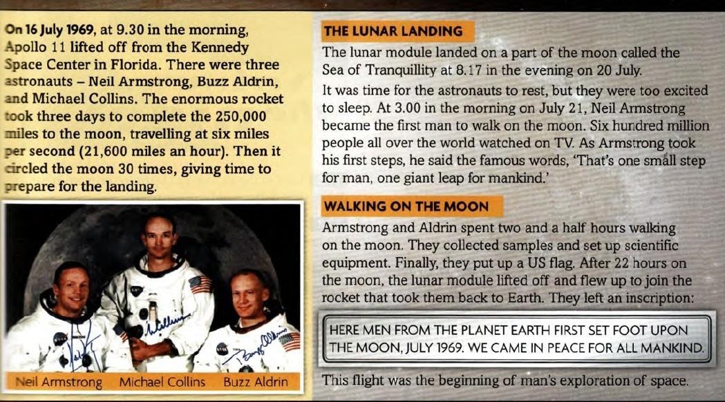 16 июля 1969 года в 9:30 утра «Аполлон-11» стартовал из Космического центра им. Кеннеди во Флориде. Было три астронавта - Нил Армстронг, Базз Олдрин и Майкл Коллинз. Огромная ракета ЛУННАЯ ПОСАДКА Лунный модуль приземлился на части Луны, называемой Море Спокойствия, в 8.17 вечера 20 июля. Настало время отдыхать астронавтам, но они были слишком взволнованы, чтобы спать. В 3 часа утра 21 июля. Нил Амстронг стал первым человеком, вышедшим на Луну. Шесть миллионов человек по всему миру смотрели по телевизору. Когда Армсронг сделал свои первые шаги, он произнес знаменитые слова: «Это один легкий шаг для человека, один гигантский прыжок для человечества. Потребовалось три дня, чтобы пройти 250 000 миль до Луны, преодолевая шесть миль в секунду (21 600 миль в час»). Затем он облетел вокруг Луны 30 раз, давая время для подготовки к приземлению. ХОДИТЬ НА ЛУНУ Армстронг и Олдрин провели два с половиной часа, гуляя по Луне. Они собрали образцы и установили научное оборудование. Наконец, они поставили Флаг США. После 22 часов на Луне лунный модуль поднялся и взлетел, чтобы присоединиться к ракете, которая доставила их обратно на Землю. Они оставили надпись: «ЗДЕСЬ С ЗЕМЛИ ПЛАНЕТЫ ВПЕРВЫЕ ПОСТУПИЛИ НА ЛУНУ, ИЮЛЬ 1969 ГОДА». МЫ ПРИШЛИ В МИРЕ ДЛЯ ВСЕГО ЧЕЛОВЕЧЕСТВА Этот полет стал началом освоения человеком космоса Нил Армстронг Майкл Коллинз Базз Олдрин.