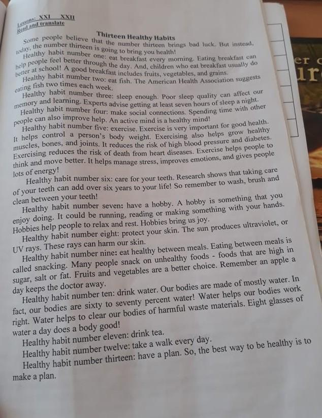 Тринадцать полезных привычек Некоторые люди считают, что число тринадцать приносит несчастье. Но вместо этого. Сегодня число тринадцать принесет вам здоровье! Здоровая привычка номер один: ешьте быстро каждое утро. Быстрое питание может помочь людям чувствовать себя лучше в течение дня. И дети, которые завтракают, обычно лучше учатся в школе! Хороший завтрак включает в себя фрукты, овощи и злаки. Здоровая привычка номер два: есть рыбу. Американская ассоциация здравоохранения предлагает кормить рыбу два раза в неделю. Здоровая привычка номер три: достаточно спать. Плохое качество сна может повлиять на нашу память и обучение. Эксперты советуют спать не менее семи часов в сутки. Здоровая привычка Humber четыре: сделать социальные связи. Проводить время с другими людьми также может улучшить помощь. Активный разум - это здоровый разум! Здоровая привычка номер пять: физические упражнения. Физические упражнения очень важны для хорошего здоровья. Это помогает контролировать вес тела человека. Физические упражнения также помогают развивать здоровые мышцы, кости и суставы. Это снижает риск высокого кровяного давления и диабета. Физические упражнения снижают риск смерти от болезней сердца. Упражнения помогают людям лучше думать и двигаться. Это помогает справиться со стрессом, улучшает эмоции и дает людям много энергии! Здоровая привычка номер шесть: уход за зубами. Исследования показывают, что уход за зубами может продлить жизнь на шесть лет! Поэтому не забывайте мыть, чистить и чистить зубы! Здоровая привычка номер семь: есть хобби. Хобби - это то, чем вы любите заниматься. Это может быть бег, чтение хобби помогает людям расслабиться и отдохнуть. Хобби приносят нам радость. Здоровая привычка номер восемь: защитите свою кожу. Солнце производит ультрафиолетовые или ультрафиолетовые лучи. Эти лучи могут нанести вред нашей коже. Здоровая привычка номер девять: есть здоровую пищу между приемами пищи. Еда между приемами пищи называется перекусывать. Многие люди едят нездоровую пищу с высоким содержанием сахара, соли или жира. Фрукты и овощи - лучший выбор. Помните, что яблочный день держит доктора подальше. Здоровая привычка номер десять: пить воду. Наши тела сделаны в основном из воды. На самом деле, наши тела на шестьдесят-семьдесят процентов состоят из воды! Вода помогает нашему телу работать правильно. Вода помогает очистить наши тела от вредных отходов. Восемь стаканов воды в день полезны для тела! Здоровая привычка номер одиннадцать: пей чай. Здоровая привычка номер двенадцать: гуляйте каждый день. Здоровая привычка номер тринадцать: есть план. Итак, лучший способ быть здоровым - это составить план. или сделать что-то своими руками