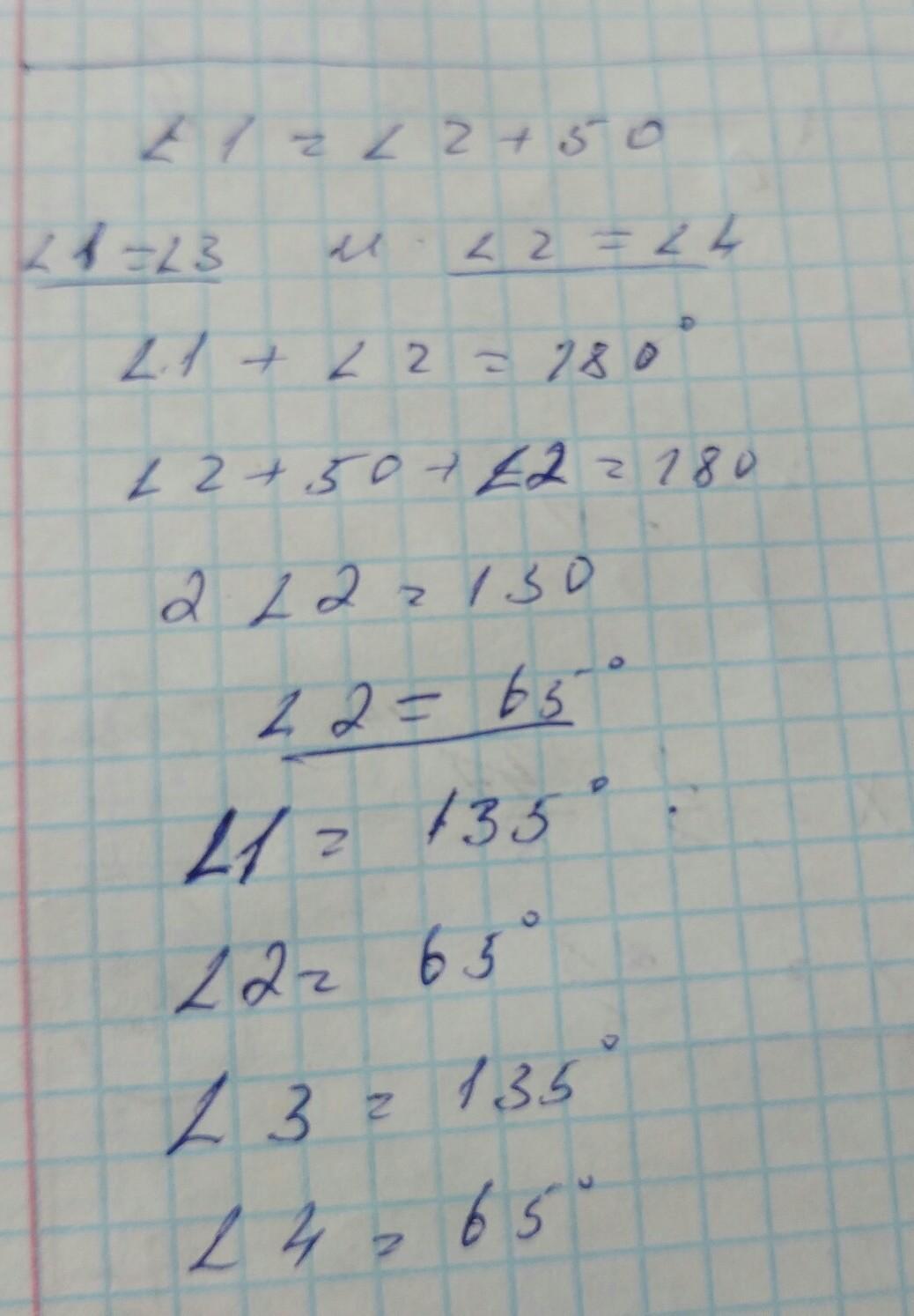 ∠1=∠2+50° ⇒ ∠1+∠2=∠2+50°+∠2=2*∠2+50°=180°