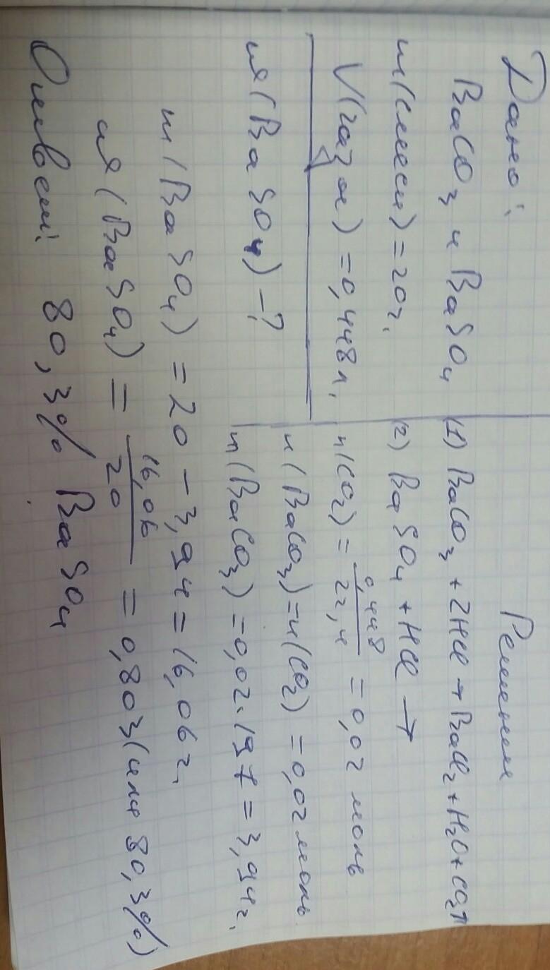 Смесь карбоната и сульфата бария массой 20г обработали раствором соляной кислоты, при этом выделилось 0.448 л газа (н.у.). Определить массовую долю сульфата бария в смеси.
