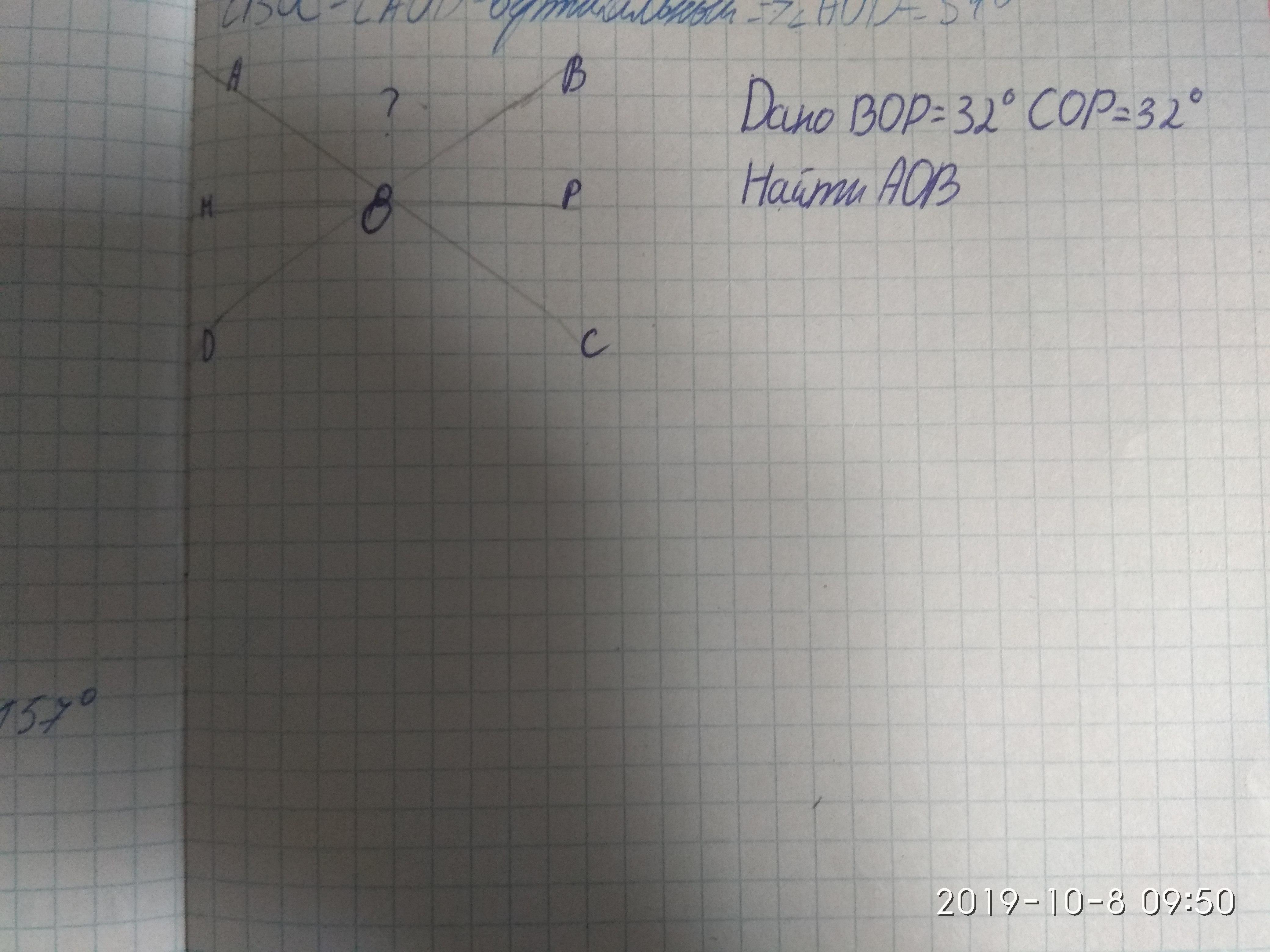 Угол BOP= 32° ; угол COP= 32°, следовательно угол ВОС= 32+32=64