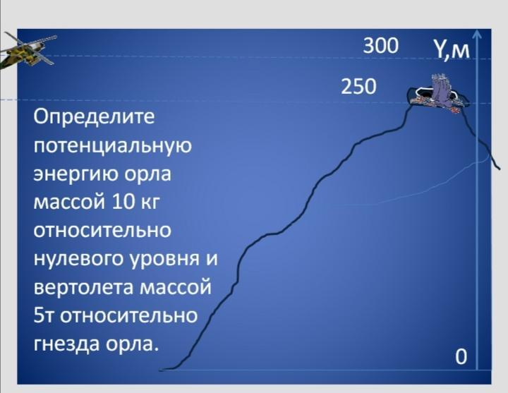 Определите потенциальную энергию орла массой 10 кг относительно нулевого уровня и вертолета массой 5т относительно гнезда орла.