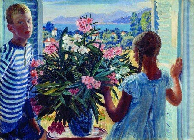 In the left of the picture we can see a boy, and in the right side we can see a girl. Between them there is a pot with flowers. Both boy and girl are staying by the window, so we can see view from the window.