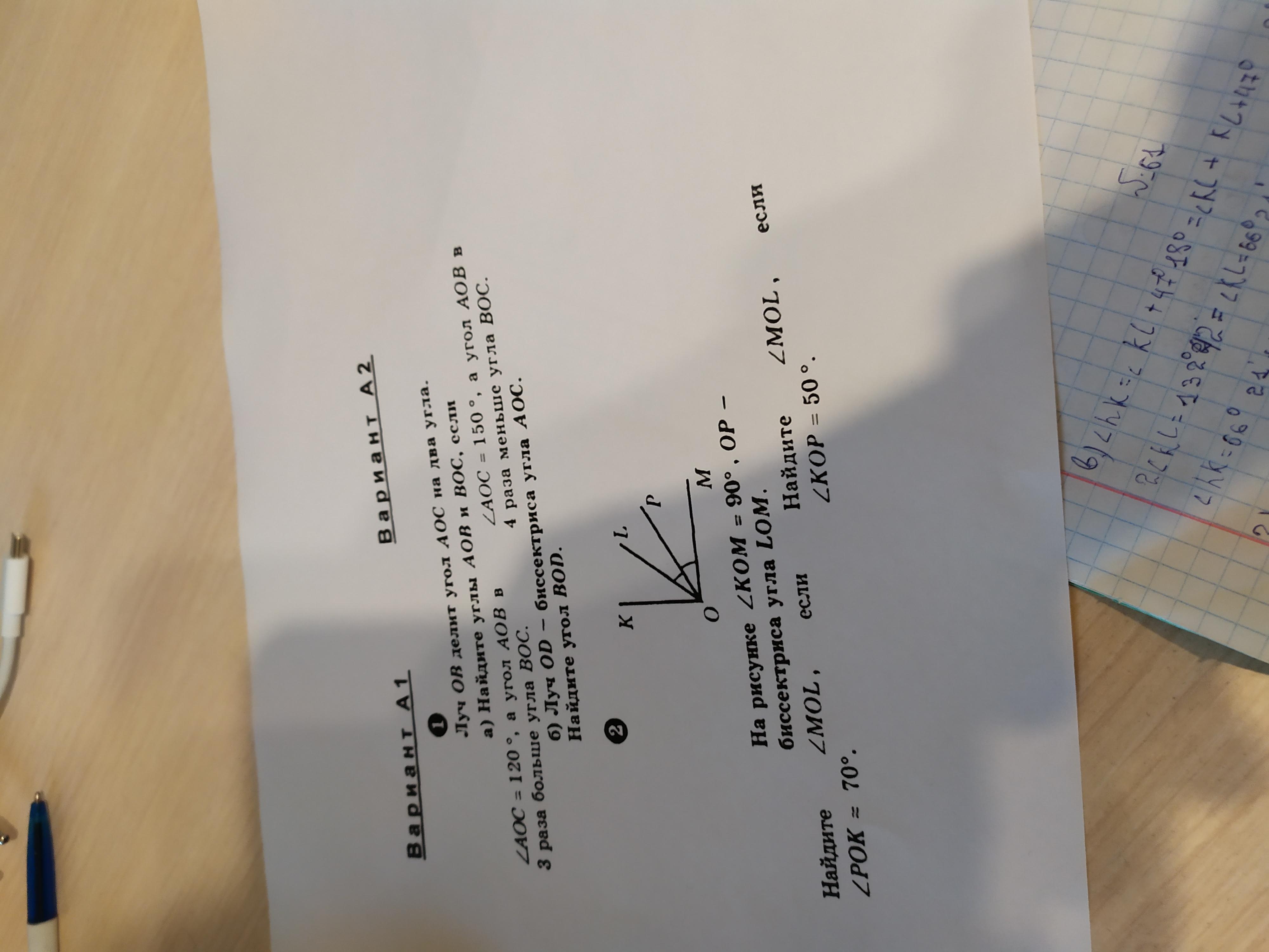 а) ∠AOC = 150°. Так как по условию ∠AOB в 4 раза меньше ∠BOC, то луч OB разделил ∠AOC в отношении 1:4 (получаем всего 5 частей), т.е. ∠AOB составляет 1/5 часть ∠AOC.