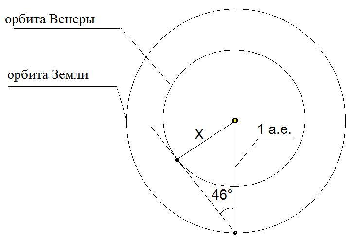 Максимальное восточное удаление Венеры от Солнца составляет примерно 46 градусов. Чему равно расстояние от Солнца до Венеры в а.е? Помогите, пожалуйста!