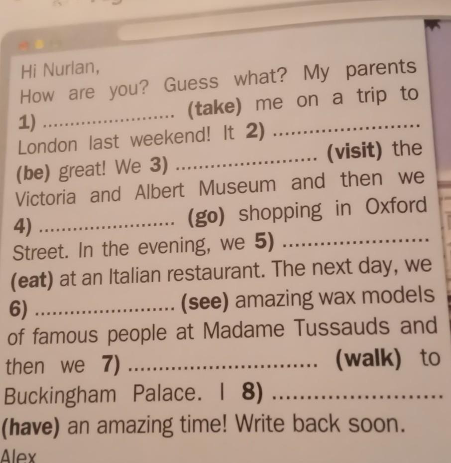 How are you? Guess what? My parents took me on a trip to London last weekend! It was great! We visited the Victoria and Albert Museum and then we went shopping in Oxford Street. In the evening we ate at an Italian restaurant. The next day we saw amazing...