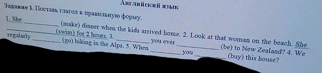 She made dinner when the kids arrived home.Look at that woman on the beach.She swam for 2 hours.Was you ever was to New Zealand?We regularly went hiking in the Alps.When bought you bought this house