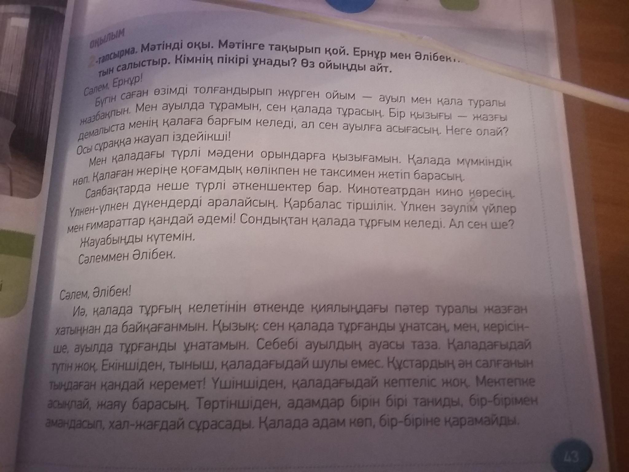 мәтінді оқы . мәтінге тақырып қой . әлібектің хатын салыстыр . кімнің пікірі ұнайды ? . өз ойыңды айт .