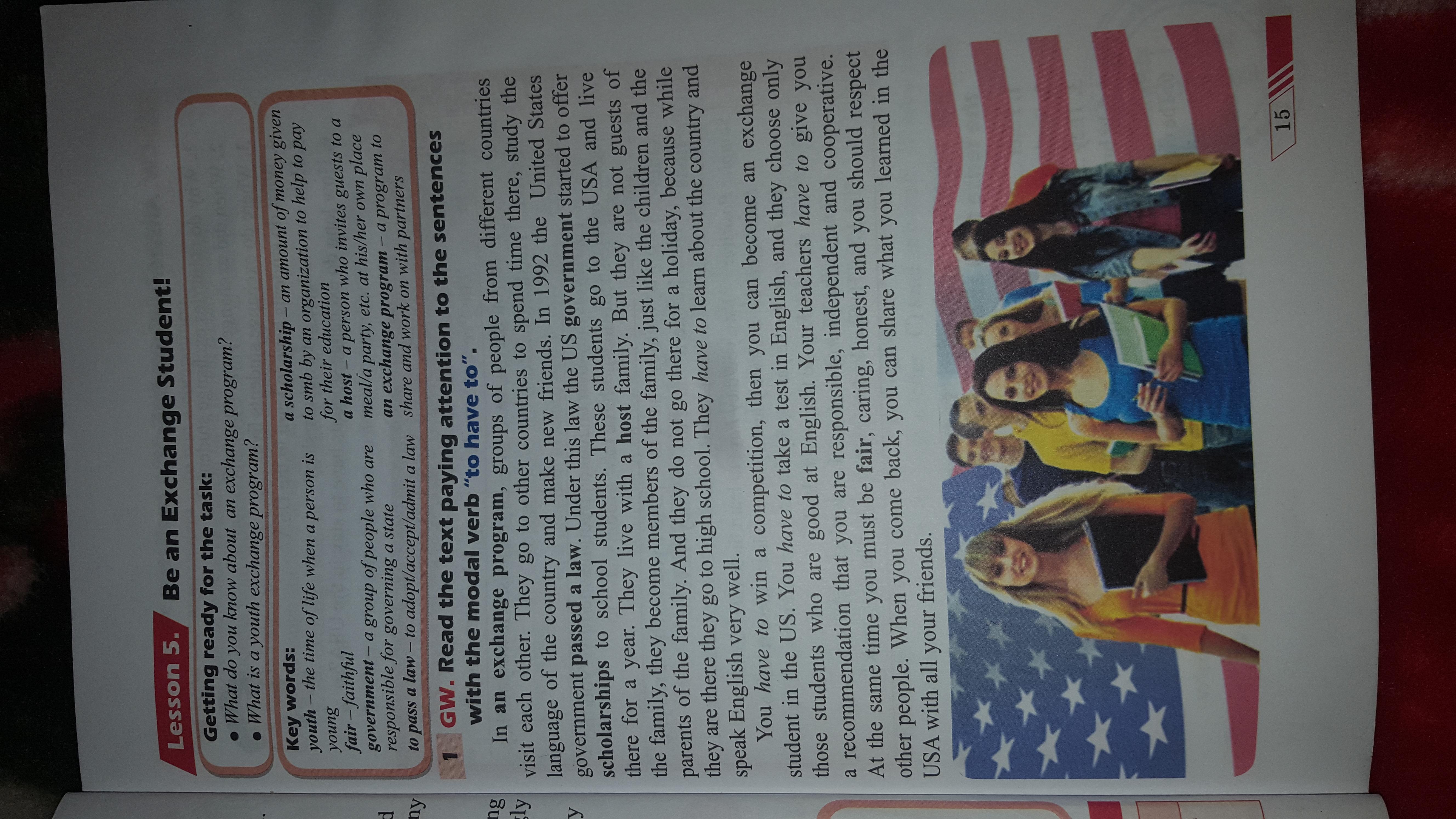 В программе обмена группы людей из разных стран посещают другие страны. Они едут в другие страны, чтобы проводить там время, изучать язык страны и заводить новых друзей. В 1992 году правительство США приняло закон. В соответствии с этим законом правительство США начало предлагать стипендии школьникам. Эти студенты едут в США и живут там год. Они живут в принимающей семье. Но они не гости семьи, они становятся членами семьи, точно так же как дети и родители семьи. И они не едут к тебе на каникулы, потому что, пока они там, они ходят в старшую школу. Они должны узнать о стране и говорить по-английски очень хорошо. Вы должны выиграть конкурс, тогда вы можете стать студентом по обмену в США. Вы должны сдать тест по английскому языку, и они выбирают только тех студентов, которые хорошо владеют английским языком. Ваши учителя должны дать вам рекомендацию о том, что вы ответственны, независимы и согласны. В то же время вы должны быть честными, заботливыми, честными и уважать других людей. Когда вы вернетесь, вы сможете поделиться своими знаниями со всеми своими друзьями в США.