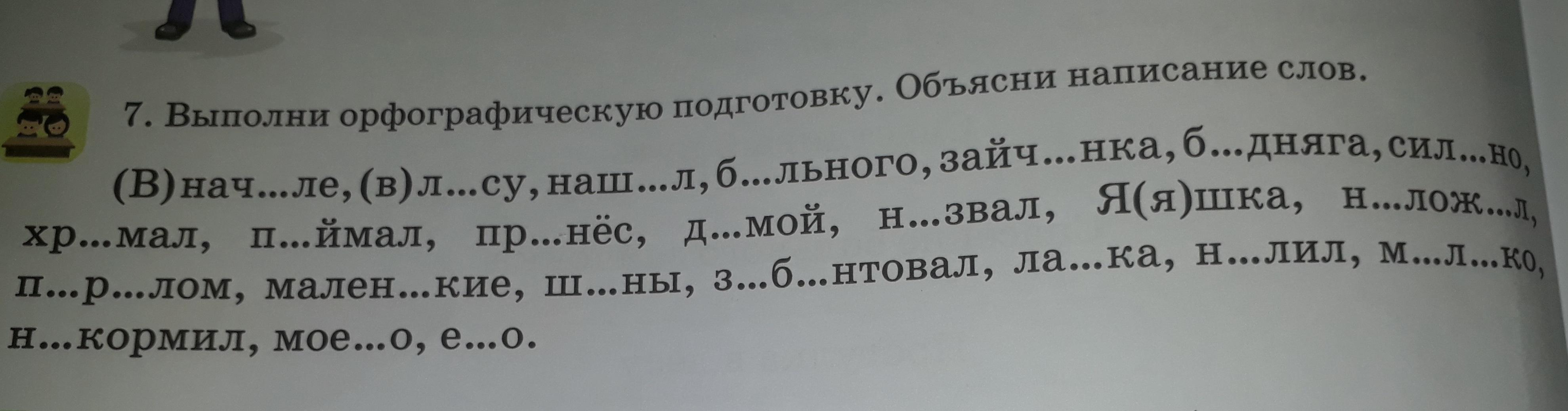 Выполни орфографическую подготовку. Объясни написание слов. В начале, в лесу, нашёл, больного, зайчонка, бедняга, сильно, хромал, поймал, принёс, домой, назвал, Яшка, наложил, перелом, маленькие, шины, забинтовал, лапка, налил, молоко, накормил, моего, его
