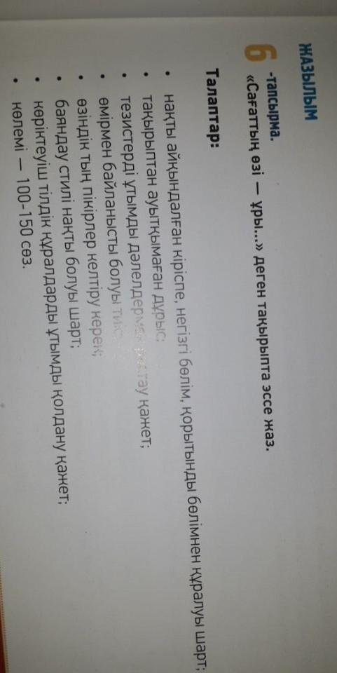 Уақыт-ол өміріміздің асыл байлығы деп айтсақта болады.Ол біздің өміріміздің жартысы.Оны тоқтату мүмкін емес.Сол сияқты адам баласының да өмір сүру уақыты белгілі бір мерзімге дейін болып келеді.Сол уақытымызды үнемді ж/е бостан бос кетірмеуіміз керек.Оның əр сағаты мен уақыты қымбат.Сондықтан біз қазірден бастап ойлануымыз керек.Өз өмірімізде бізге керек емес заттарға уақытымызды кетірмей ,өзімізге пайдалы істермен шұғылдануымыз керек.Уақыттың байлығын түсіне білейік.