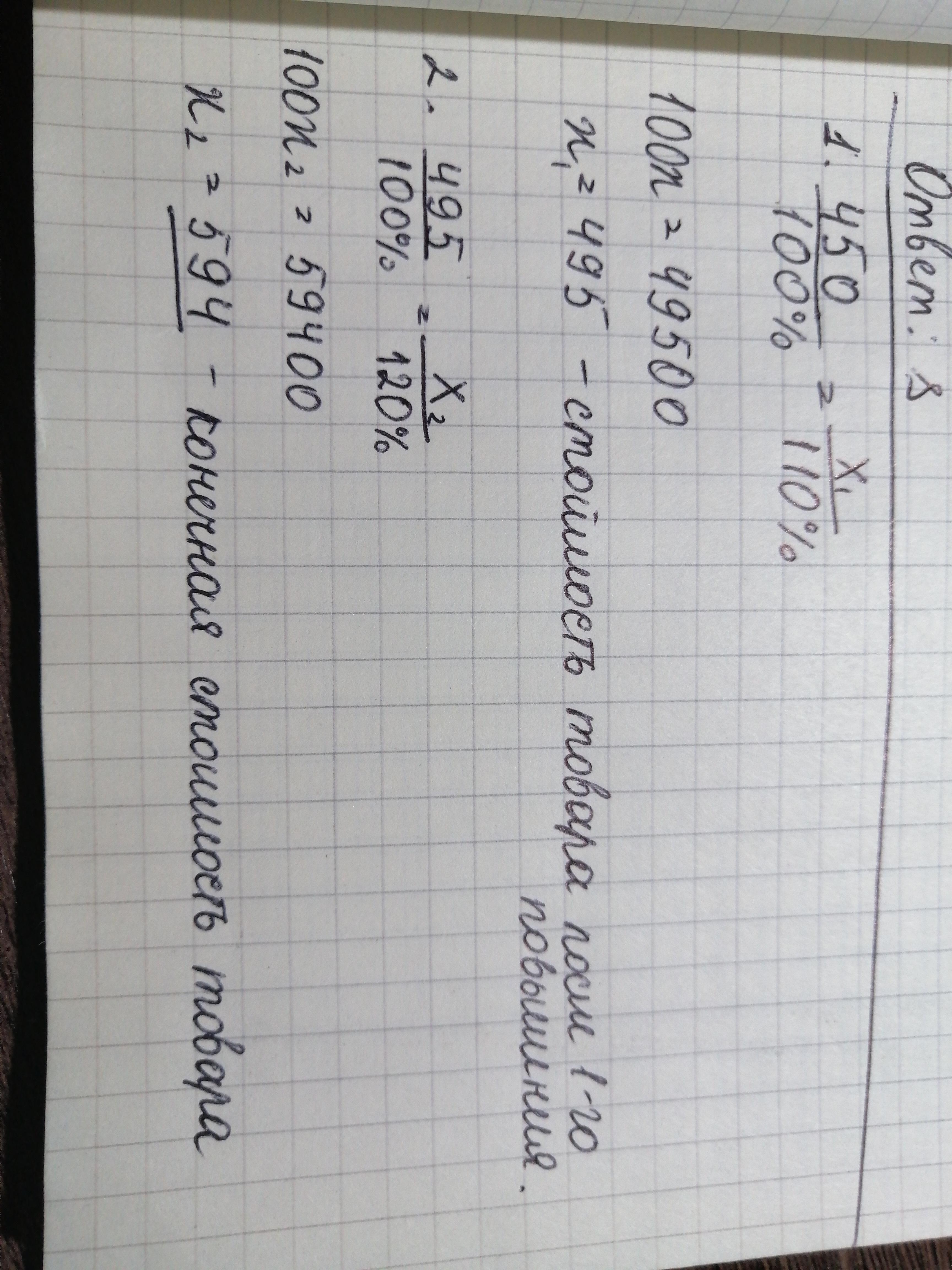 Товар стоил 450 р. Определите его цену после двух повышений цены - сначала на 10%, потом на 20%.