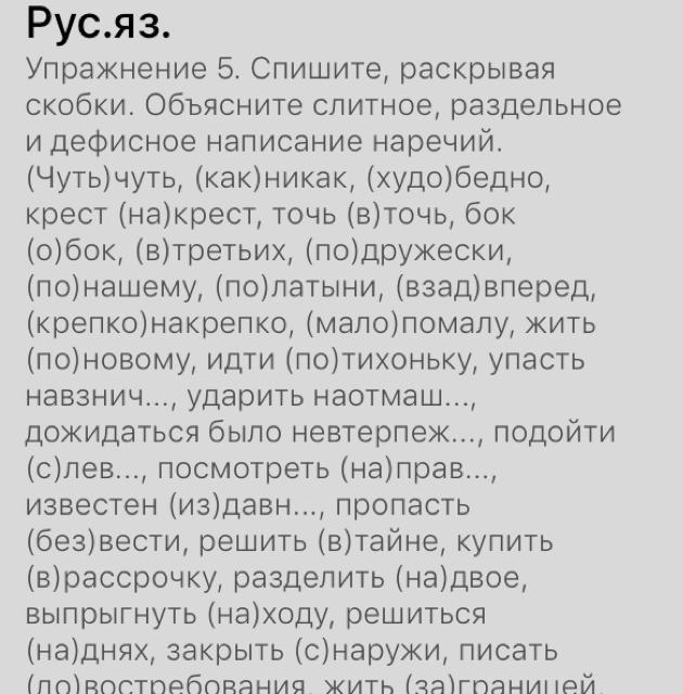 Чуть-чуть, как-никак, худо-бедно, крест-накрест, точь-в-точь, бок о бок, в-третьих, по-дружески, по-нашему, по-латыни, взад-вперед, крепко-накрепко, мало-помалу, жить по-новому, идти потихоньку, упасть навзничь, ударить наотмашь, дожидаться было невтерпеж, подойти слева, посмотреть направо, известен издавна, пропасть без вести, решить втайне, купить в рассрочку, разделить надвое, выпрыгнуть на ходу, решиться на днях, закрыть снаружи, писать до востребования, жить за границей.