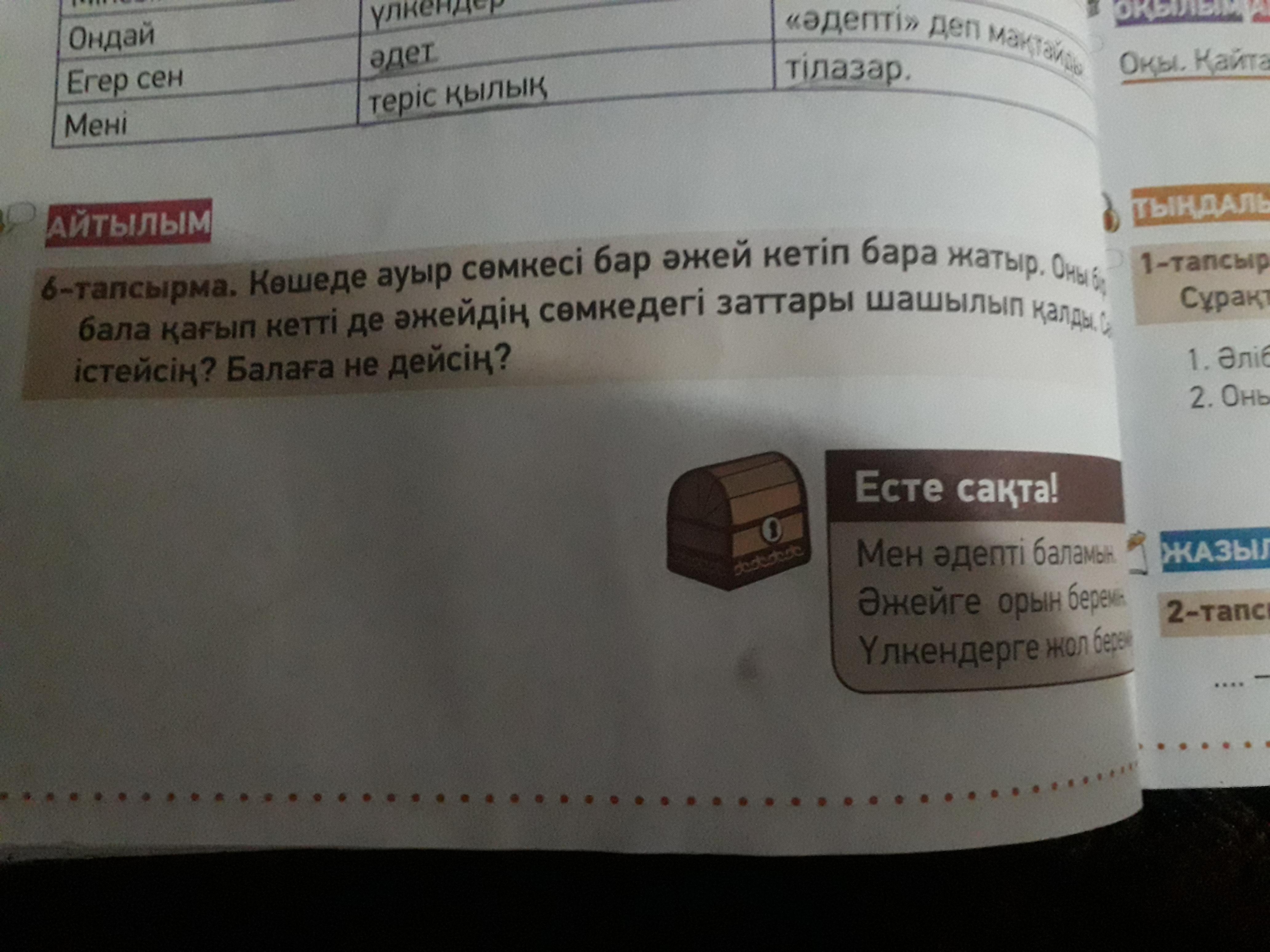 Объяснение: Әжейдін заттарын жинауға көмектесемин.Балаға жан-жағына қарап, абай бол деймин!