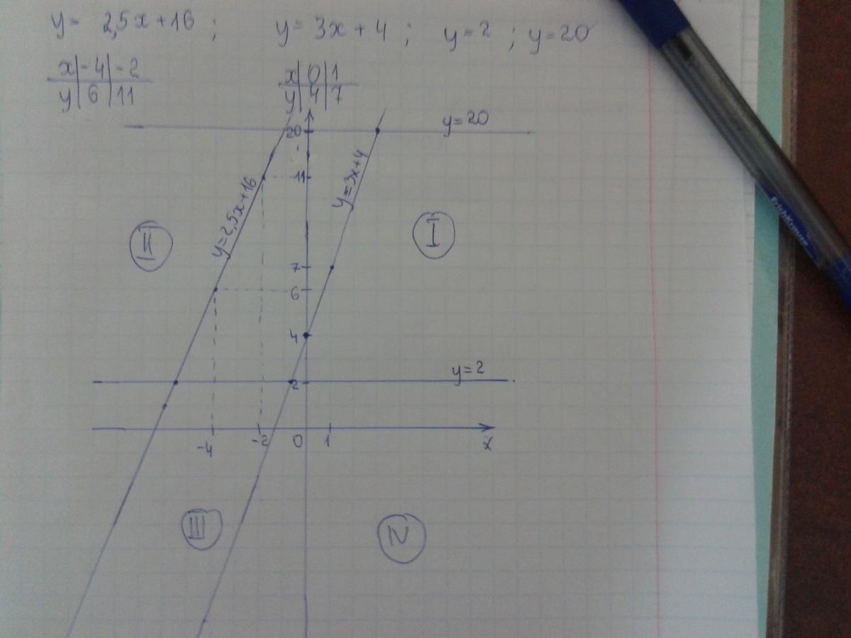 Для графика у=20 у меня не хватило листа, поэтому когда будешь чертить у тебя прямые пересекутся в 1 координатной четверти, а ответ и все остальное правильное.