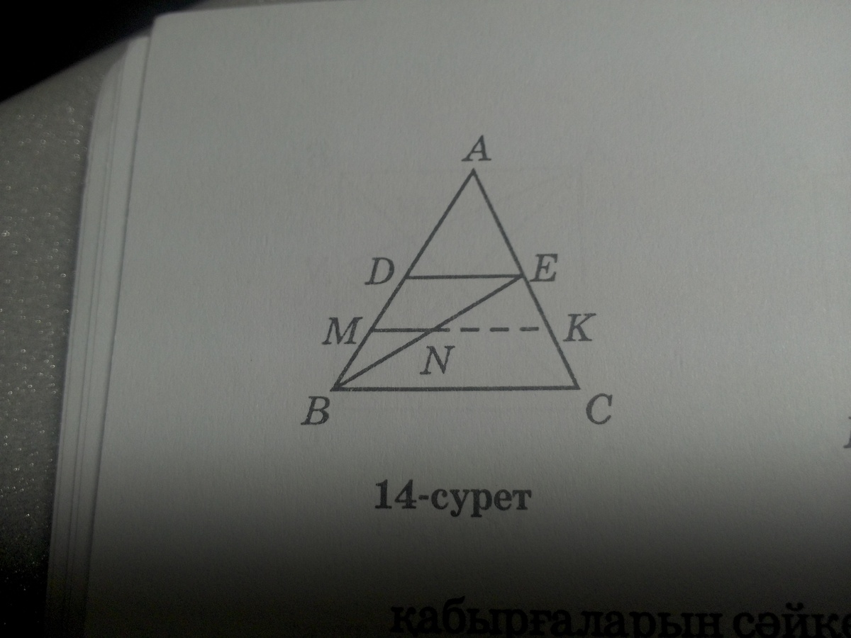 ABC үшбұрышында DE - орта сызық . М жане N - сәйкесiнше BD және BE-н1н орталары. EK = KC, NK = 5 см болғанда, BC және MN табыңдар.