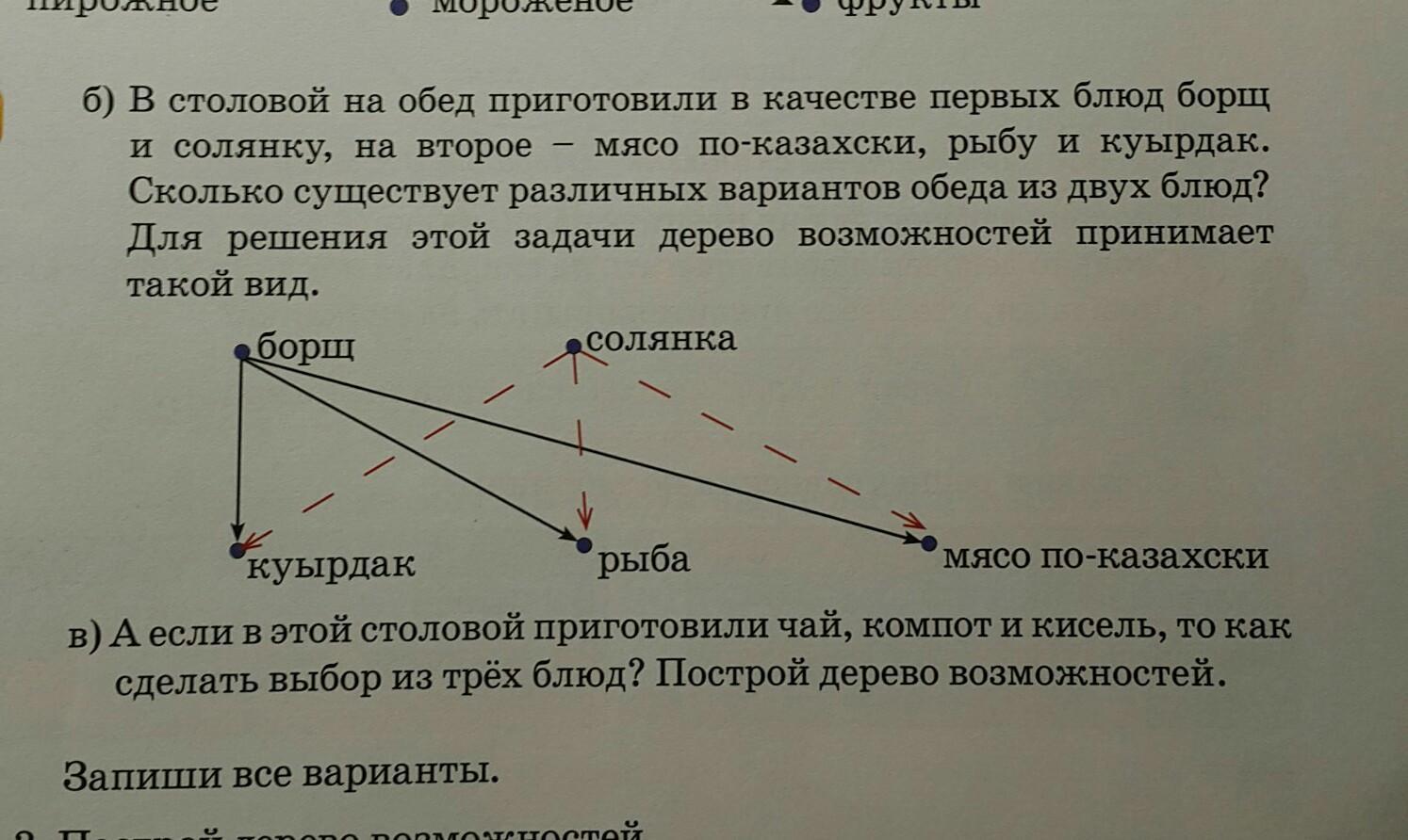 Получается все 6 вариантов: борщ и куырдак; борщ и рыба; борщ и мясо по-казахски.
