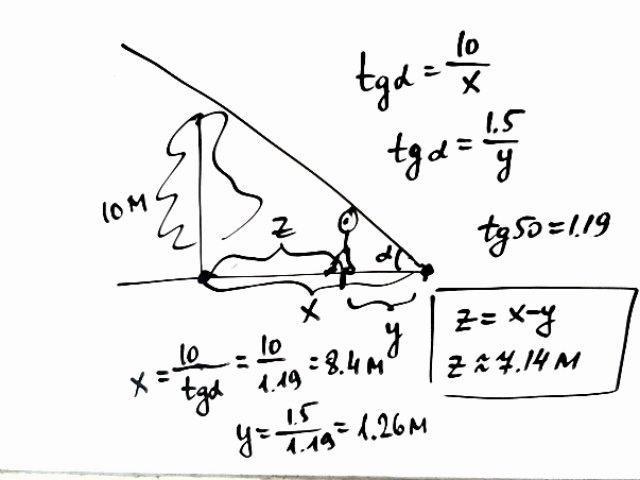 На каком расстоянии от дерева находится человек ростом 1,5 м, высота дерева 10 м. Угловая высота источника света 50 градусов (tg 50 градусов = 1,19)