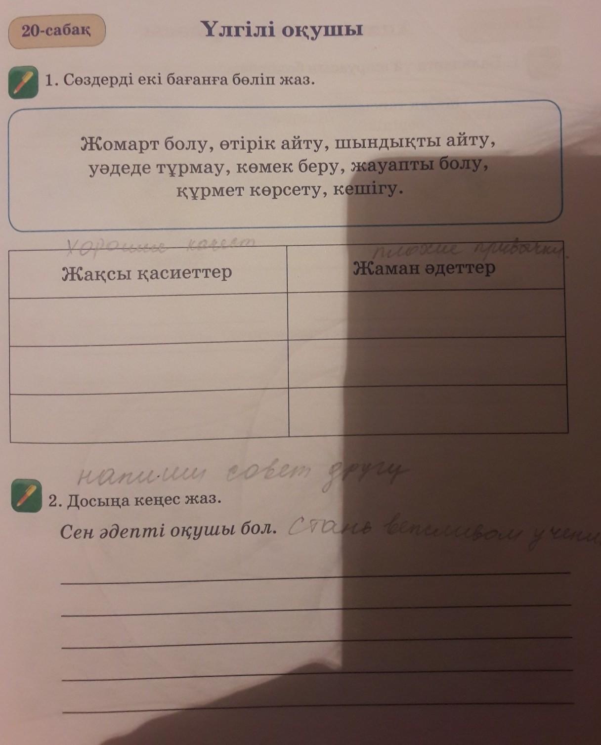 Жақсы қасиет:жомарт болу, шындық айту, көмек беру, жауапты болу, құрмет көрсету.