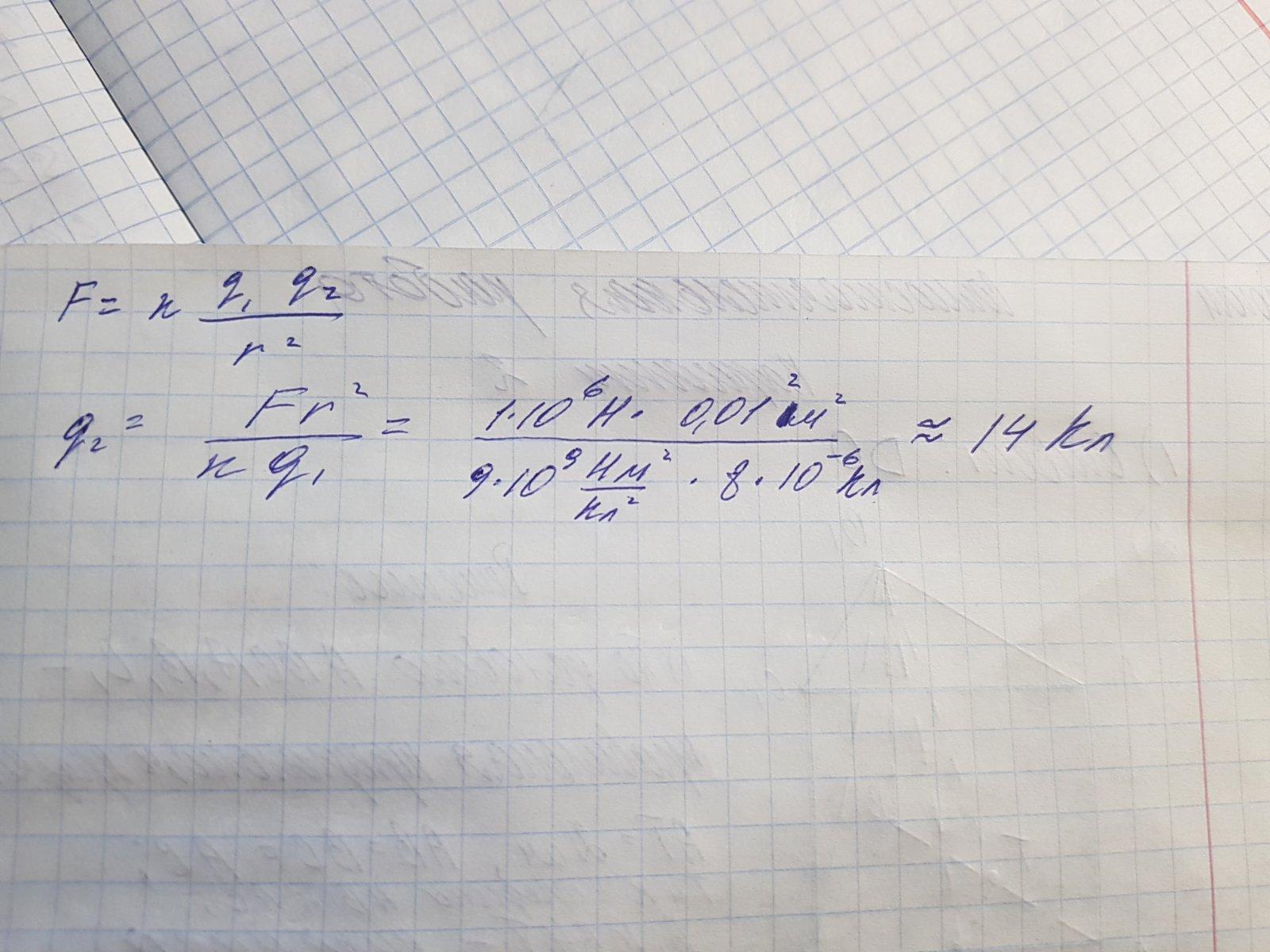 Сила взаимодействия двух точеных зарядов на расстоянии 1 см = 1 МH. Величина одного из зарядов 8Мк Кл. Определить величину второго заряда.