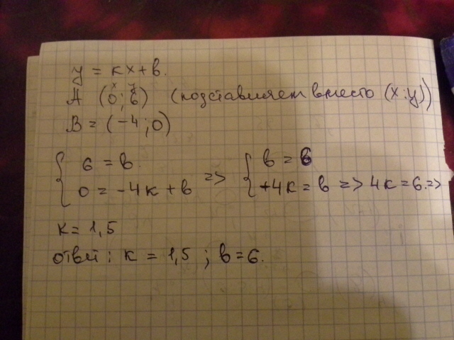 ПРЯМАЯ ЯВЛЯЮЩЕЙСЯ ГРАФИКОМ ФУНКЦИИ,ЗАДАННОЙ ФОРМУЛОЙ y=kx+b,ПЕРЕСЕКАЕТ ТОЧКИ А (0;6)B(-4;0)НАЙДИТЕ k и b.