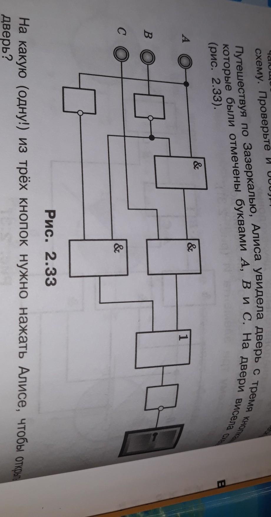 Путешествуя по Зазеркалью, Алиса увидела дверь с тремя кнопками, которые были отмечены буквами А,В и С. На двери висела схема(рис. 2.33) На какую (одну!) из трех кнопок нужно нажать Алисе, чтобы открыть дверь?