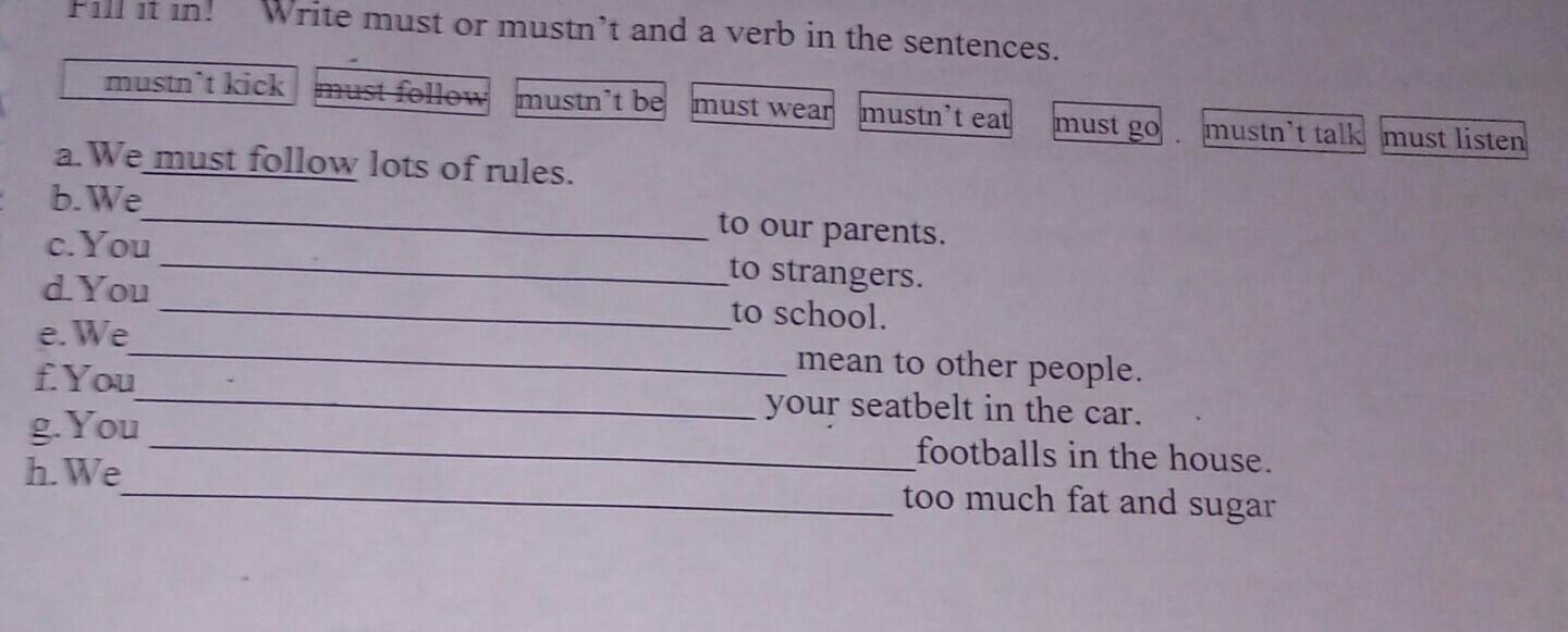 Ответ:b-must listen; c-mustn`t talk; d- must go; e-mustn`t be; f- must wear;