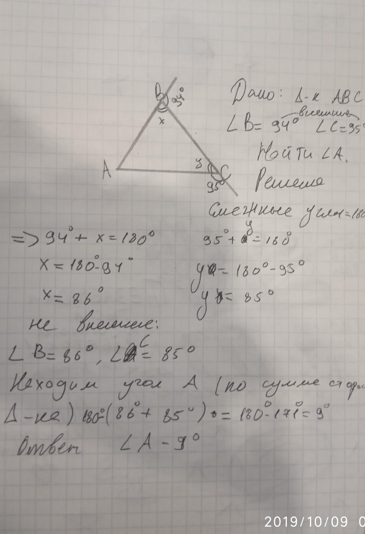 в треугольнике ABC внешние углы при вершинах B и C равны 94° и 95° соответственно . найдите градусную меру угла А