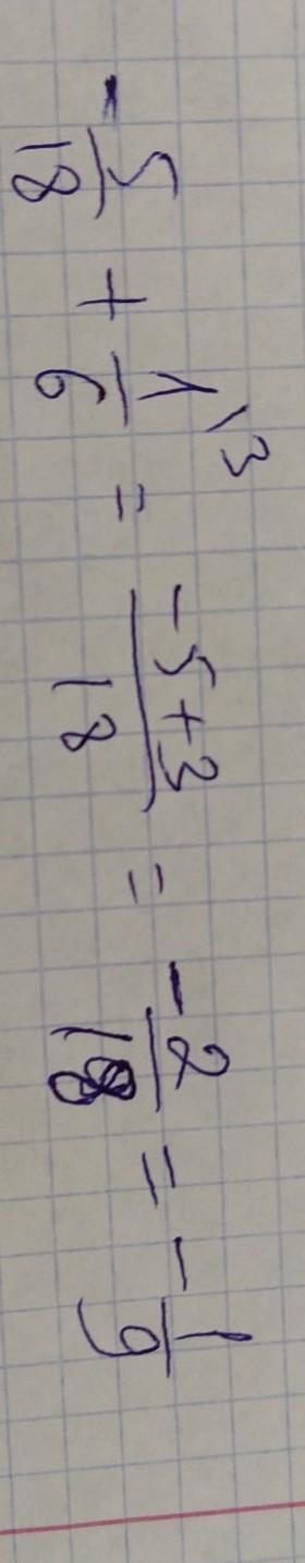 Пошаговое объяснение:-5/18+1/6=-5/18+3/18=-2/18=-1/9