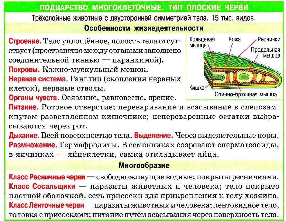 Плоские черви — двусторонне-симметричные животные. Часть из них — свободноживущие хищники, обитающие в морях и пресных водоемах, другие — паразиты позвоночных животных и человека, вызывающие различные заболевания. Размеры тела червей — от долей миллиметра до 10 м. Их тело удлиненное, вытянутое, сплюснутое в спинно-брюшном направлении. Тип включает три класса: Ресничные, Сосальщики и Ленточные.