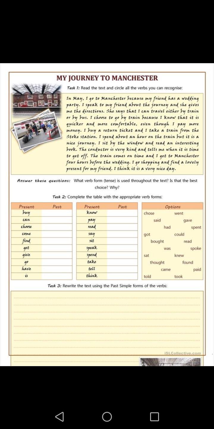 In May, I went to Manchester because my friend had a wedding party. I spoke to my friend about the journey and she gave me the directions. She said the I can travel either by train or by bus. I chose to went train because I knew that it is quicker and more comfortable, even though I pay more money. I bought a return ticket and I took a train from the Stoke station. I spent about an hour on the train but it was a nice journey. I sat by the window and read an interesting book. The conductor was very kind and told me when it is time to get off. The train came on time and I got to Manchester four hours before wedding. I went shopping and found a lovely present for my friend. I thought it was a very nice day.