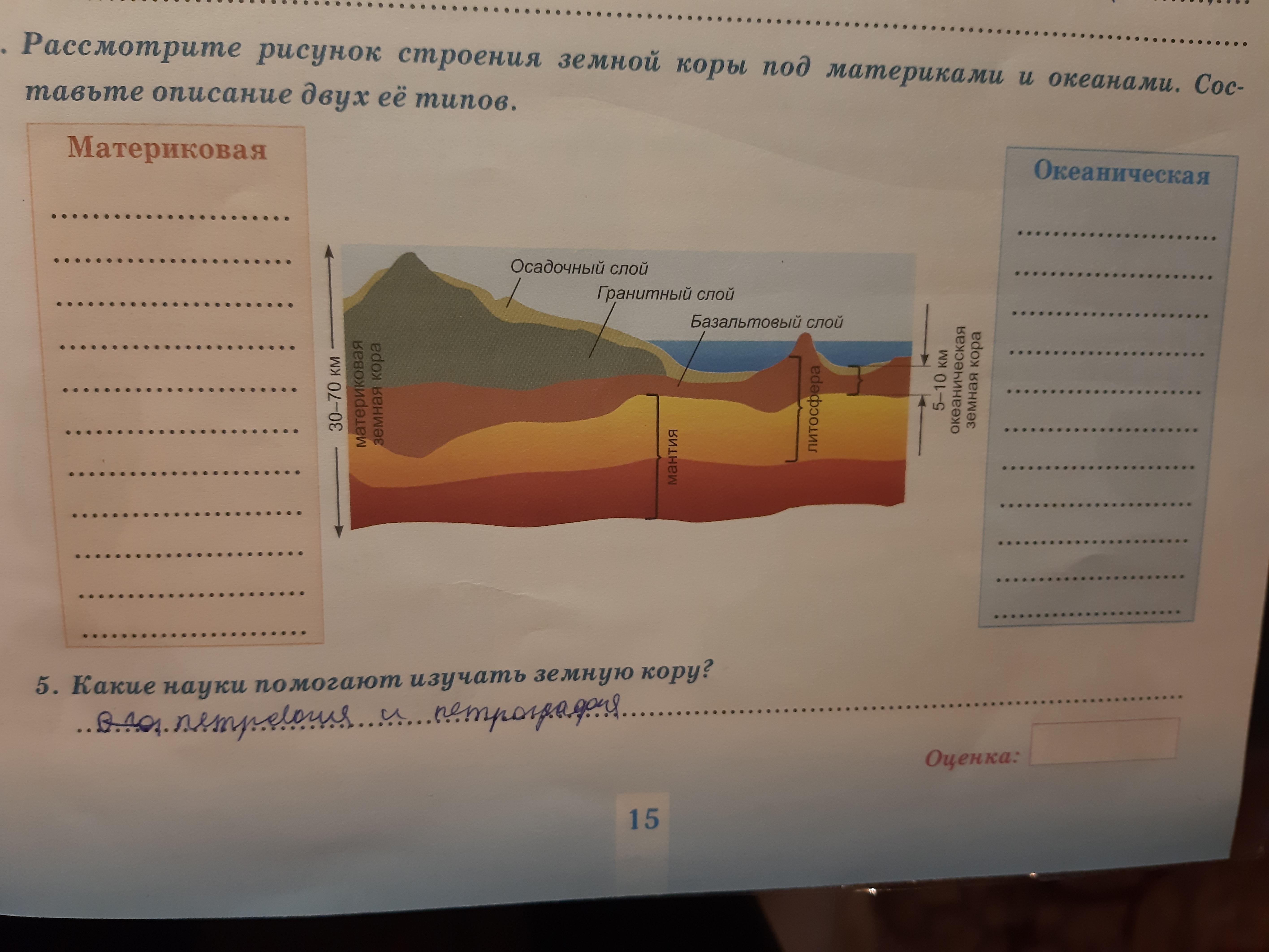 Рассмотрите рисунок строения земной коры под материками и океанами.Составьте описание двух ее типов