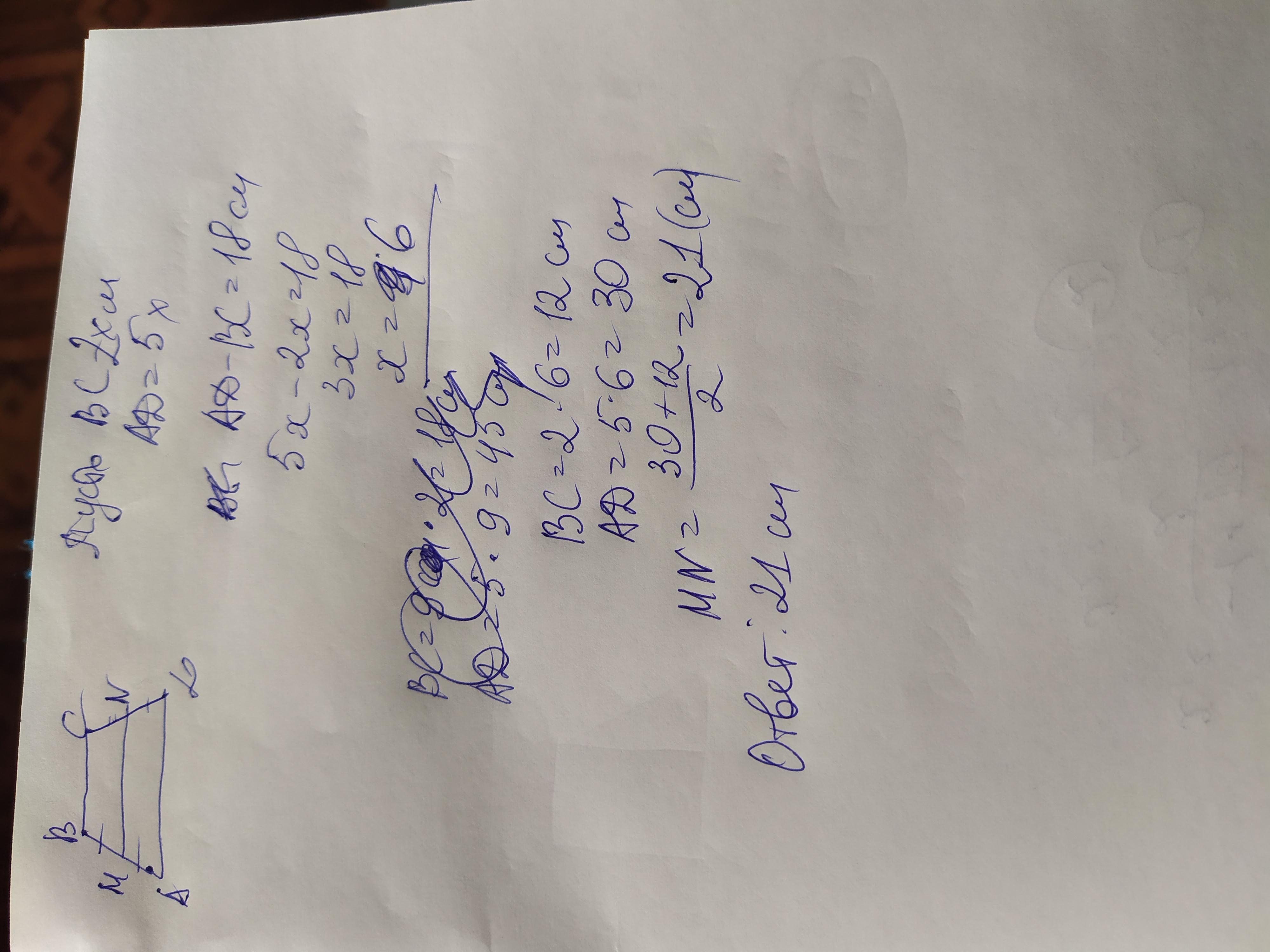 Сви основания трапеции относятся как 5:2 а их разность равна 18 см найдите среднюю линию трапеции