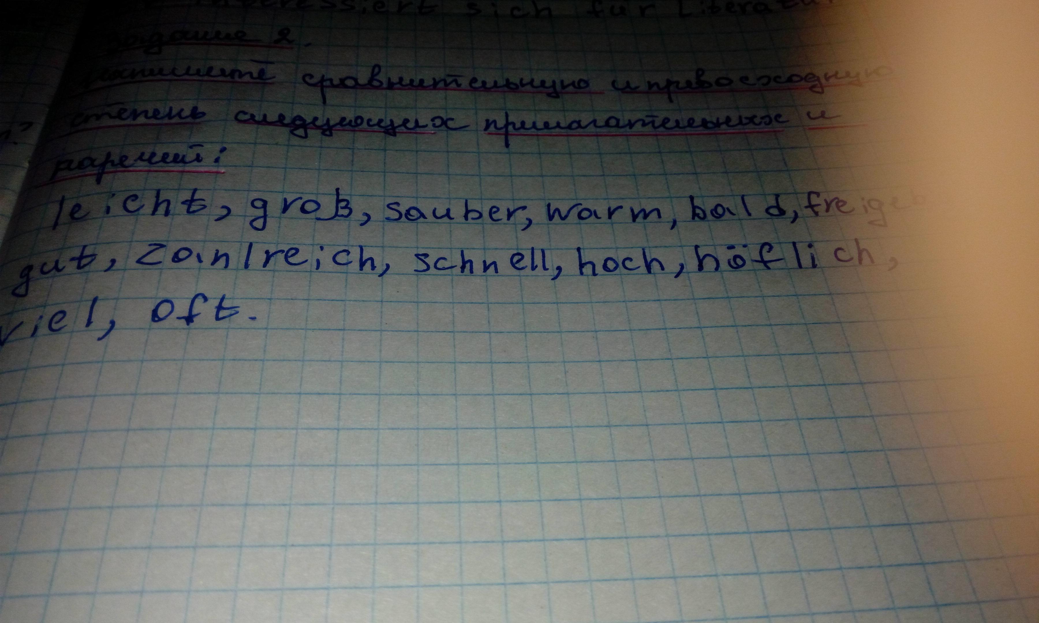 Напишите сравнительную и превосходную степень следующих прилагательных и наречий: leicht, grob,sauber,warm,bald,freigebig,gut,zanlreich,schnell,hoch,hoflich,viel,oft.