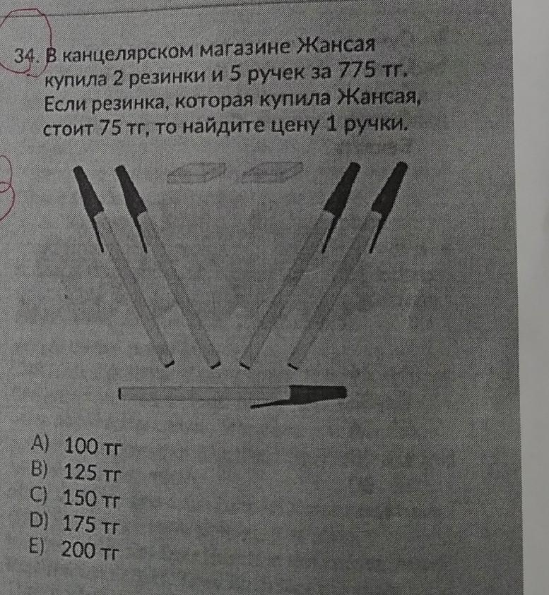 Пошаговое объяснение:1 резинка 75тг то 2 резинки 150 так ка ручек 5 то разность делим на 5