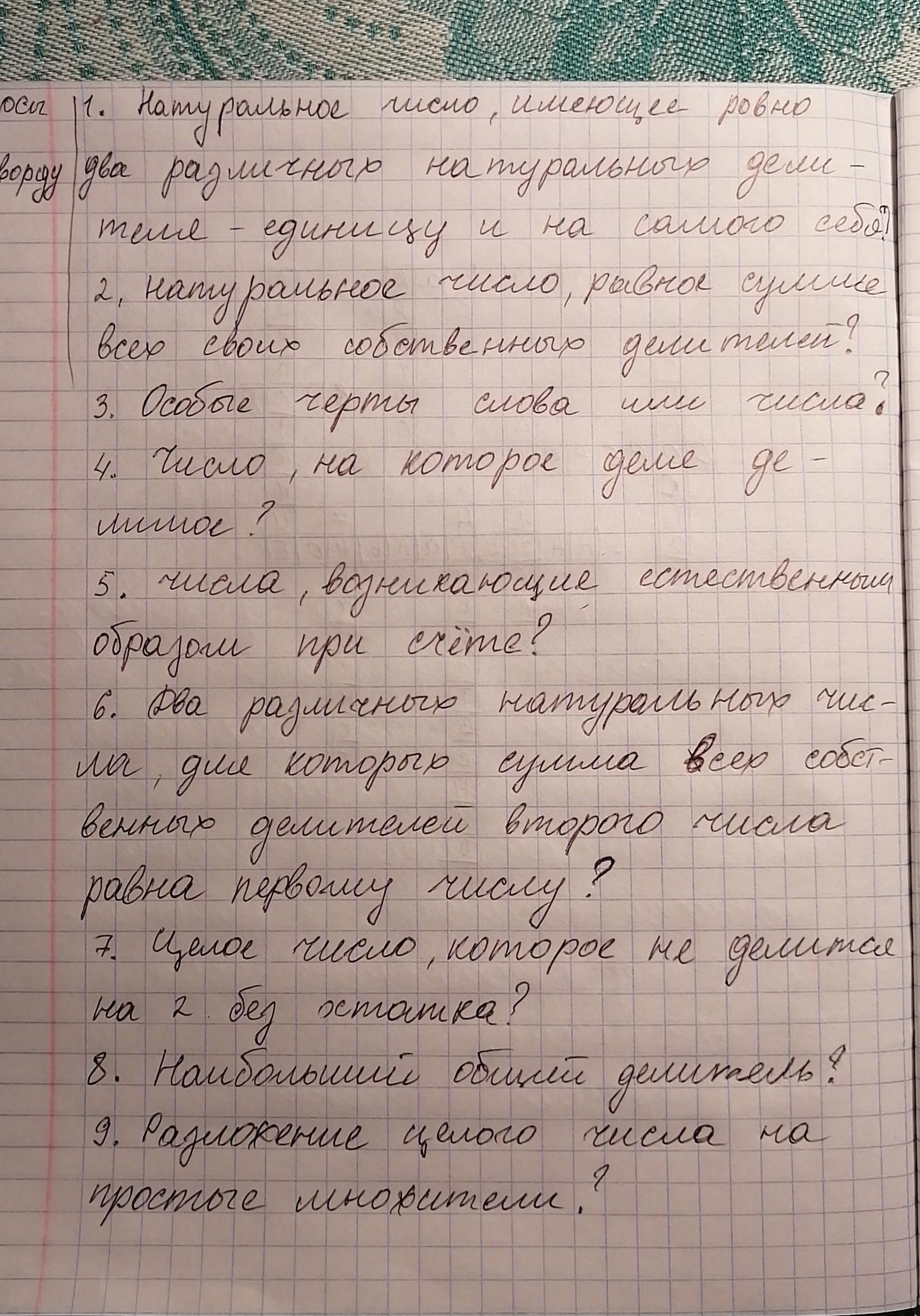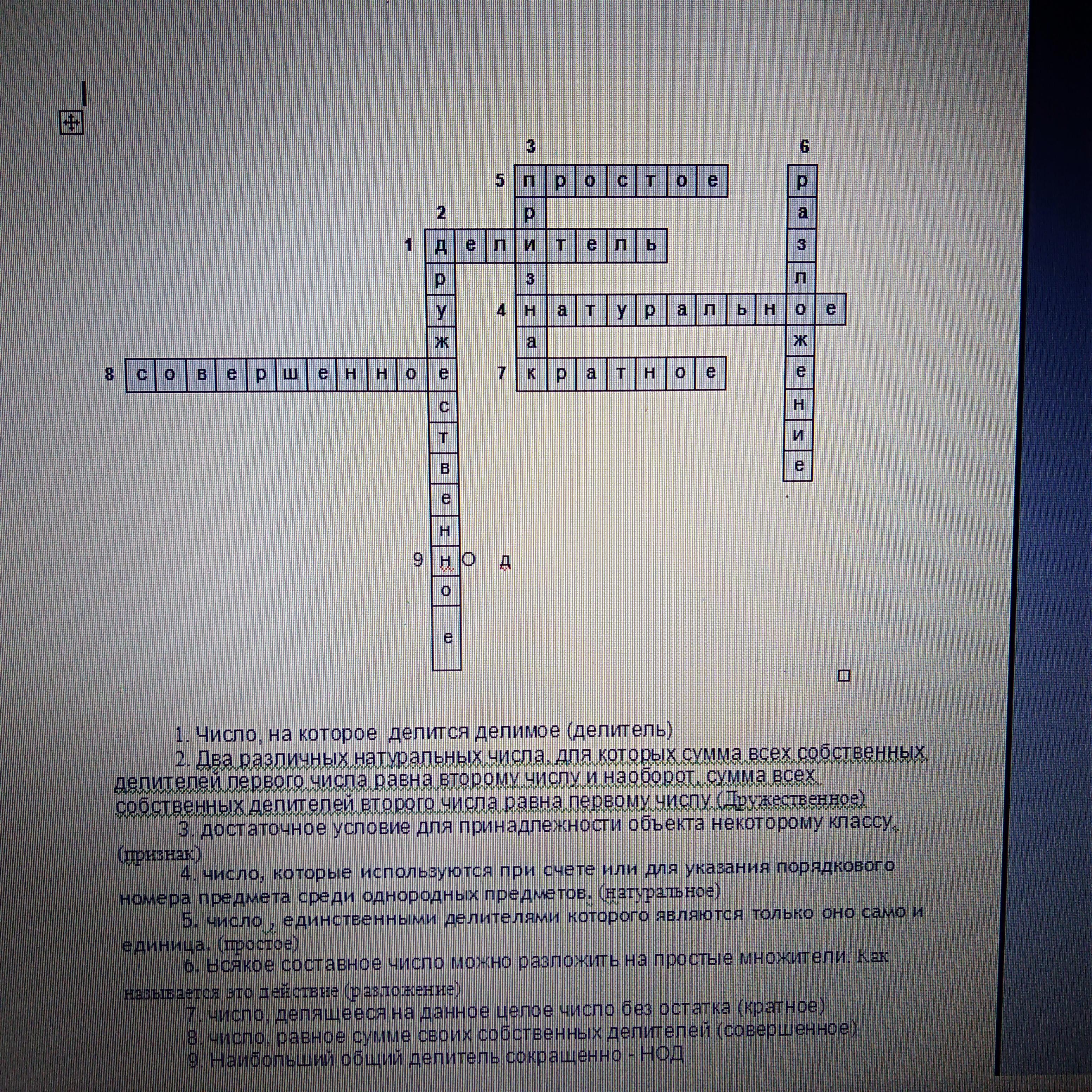 30 баллов ,,Составьте кроссворд со словами : делитель, кратное, простое,совершенное,друдественное,натуральное, признак, нечётное,разлодение, НОД