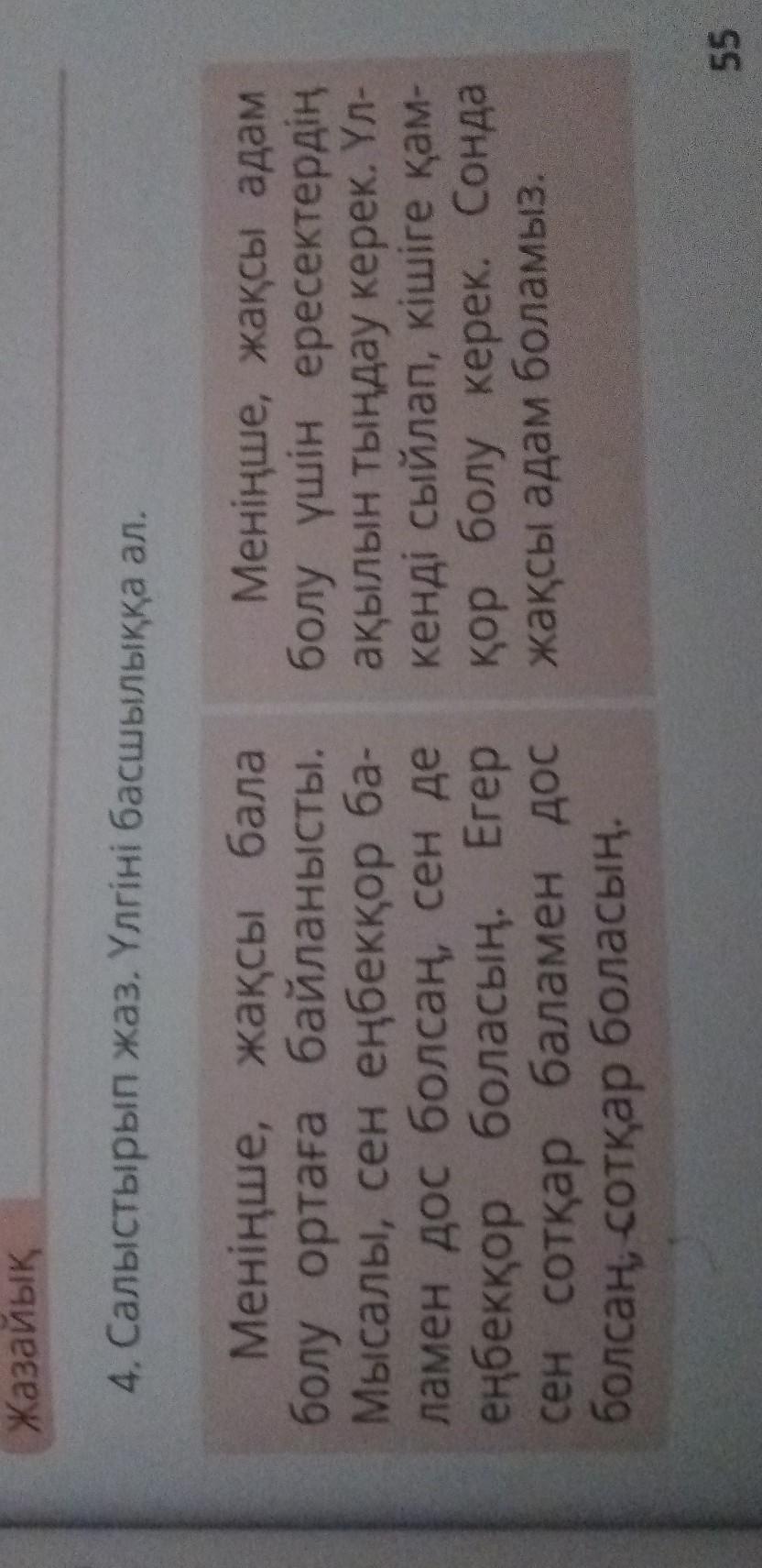 Екі мәтіндеде жақсы бала туралы айтылған.Бірақ мен бірінші мәтіндегі сөздерге толық қосылмаймын. Себебі жақсы немесе жаман бала болу жаныңдағы достарыңа ғана байланысты емес,адам өз-өзін түзей білуі қажет тек сонда ғана үлгі тұтар жақсы бала болады. Әрине жәнеде үлкенге құрмет, кішіге ізет көрсетуіміз керек. Сонда ғана ең жақсы бала боламыз деп ойлаймын.