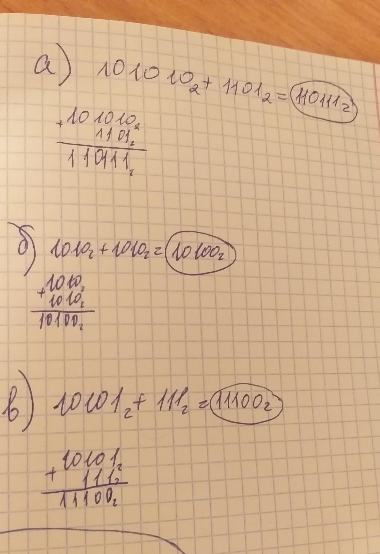в) 10101 + 111.