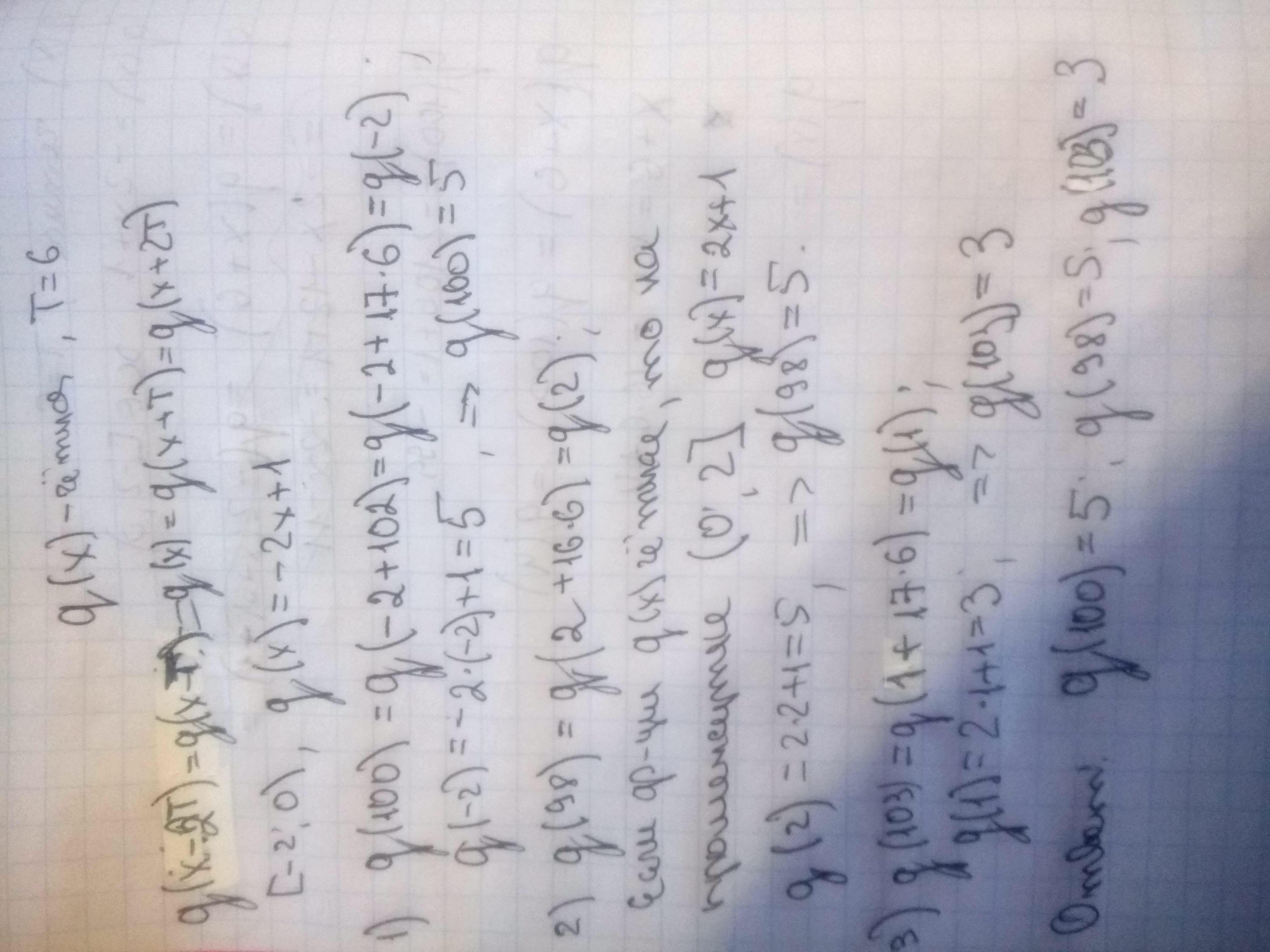 функция g(x) Четная и имеет переод Т=6,на множестве х€[-2;0) имеет место равенство g(x)=-2x+1. Найдите g(100) g(98), g(103)