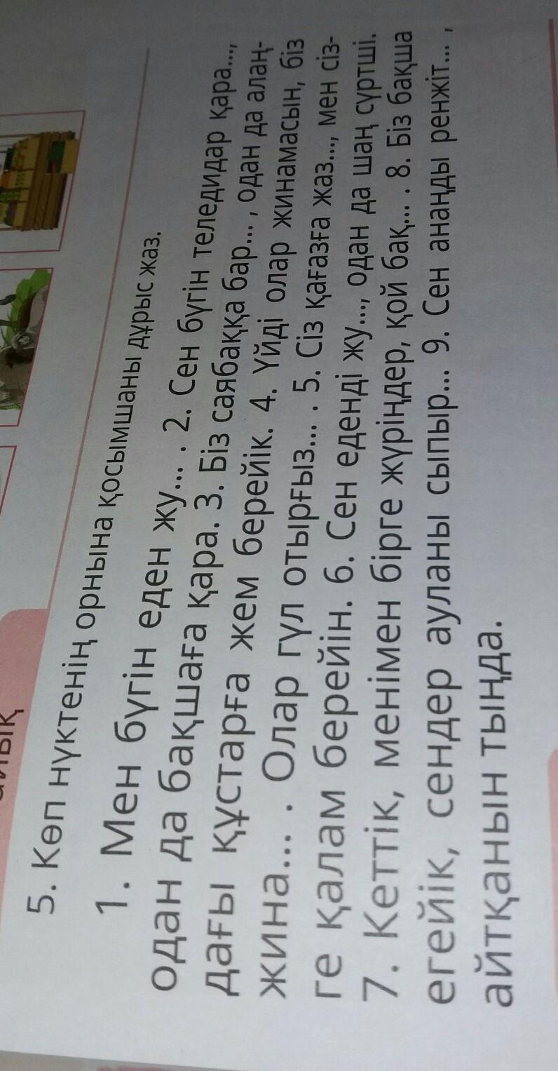 Мен бүгін еден жудым.Сен бүгін теледидар қарадың,одан да бақшаға қара.Біз саябаққа барамыз,одан да алаңдағы құстарға жем берейік.