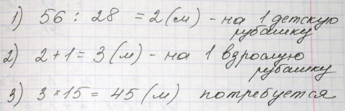 Из 56 м ткани сшили 28 детских рубашек . сколько нужно материала ,чтобы сшить 15 рубашек для взрослых,если на каждую взрослую требуется на 1 м больше ткани чем на детскую