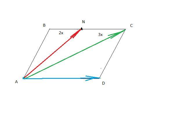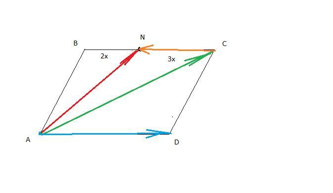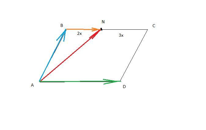В параллелограмме ABCD точка N делит сторону ВС в отношении 2 :3 считая от вершины B. Разложите вектор AN по векторам а) AD и AD