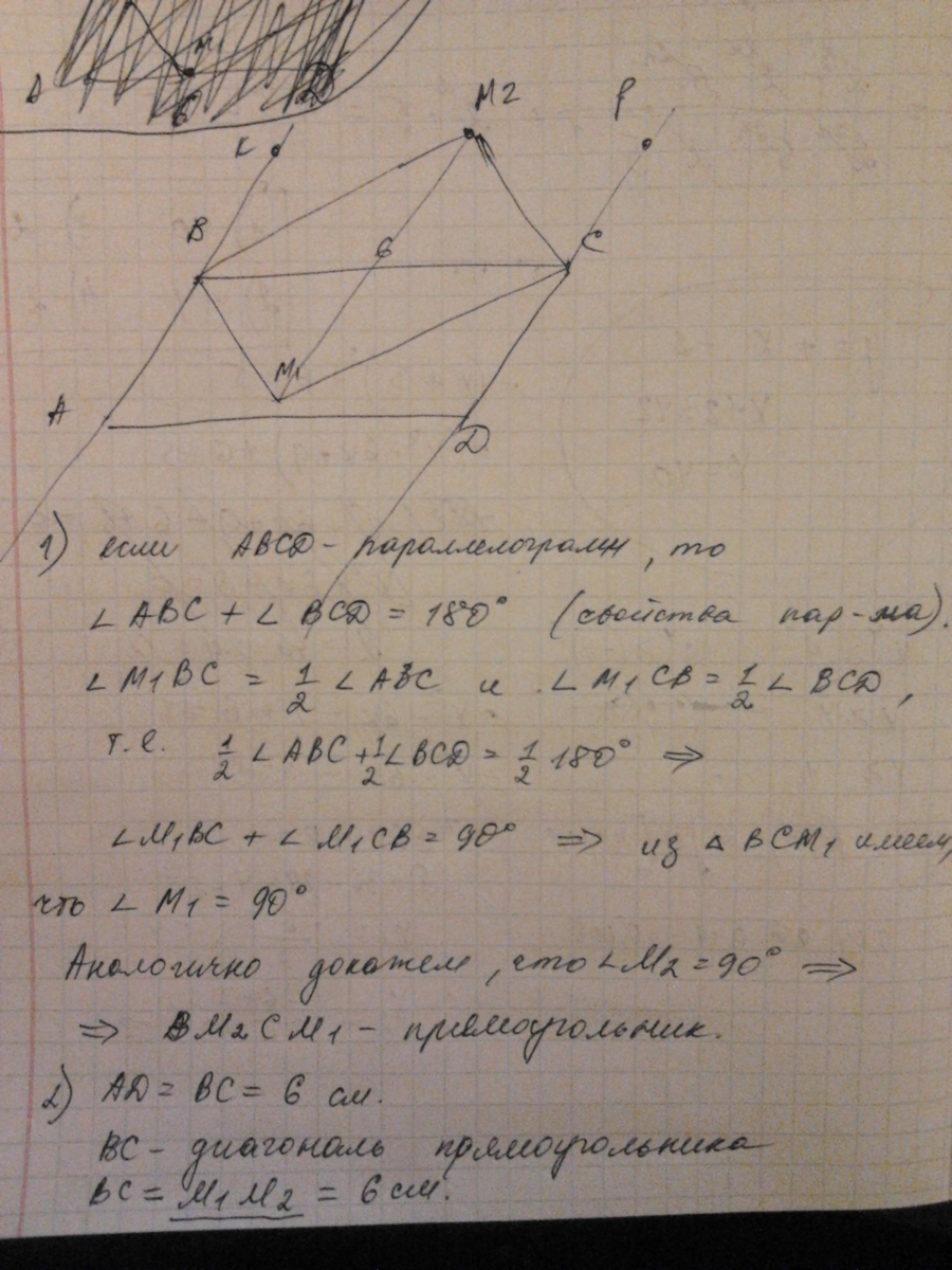 В параллелограмме ABCD AD = 6 см. Биссектрисы углов ABC и BCD пересекаются в точке М1. На продолжении прямых АВ и CD взяты точки К и Р так, что А− В − К, D − С − Р. Биссектрисы углов КВС и ВСР пересекаются в точке М2. Найдите М1М2.