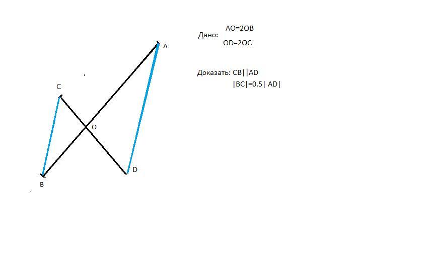 Полученные треугольники ВОС и АОD подобны по 2 сторонам и углу между ними