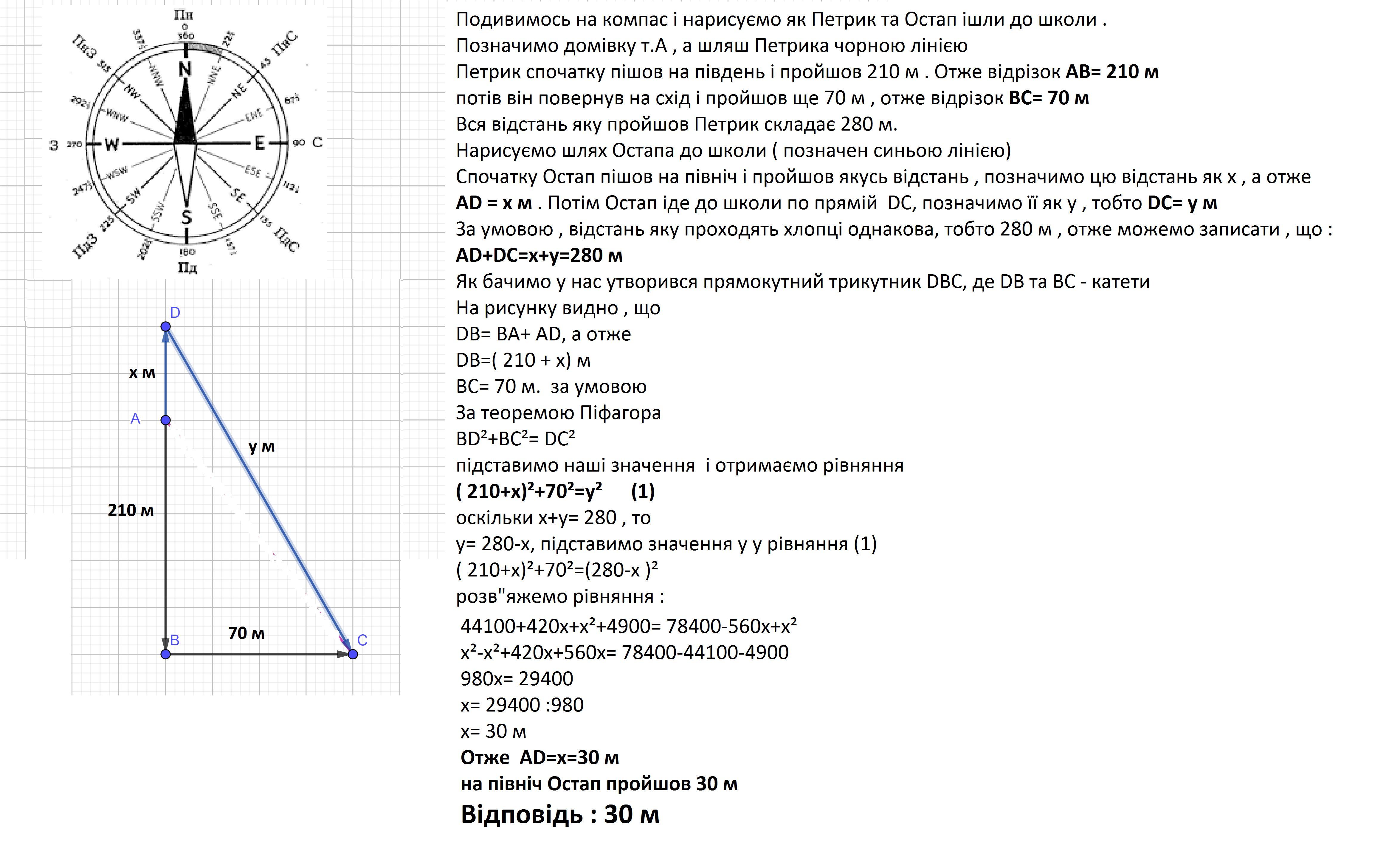 Близнюки Петро та Остап посварилися і стали ходити з дому до школи різними шляхами. Петро спочатку йде 210 метрів на південь, а далі 70 метрів на схід і потрапляє до школи. Остап спочатку йде певний час на північ, а далі по прямій до школи. Скільки саме метрів Остап йде на північ, якщо близнюки ходять з однаковою швидкістю і приходять до школи одночасно?