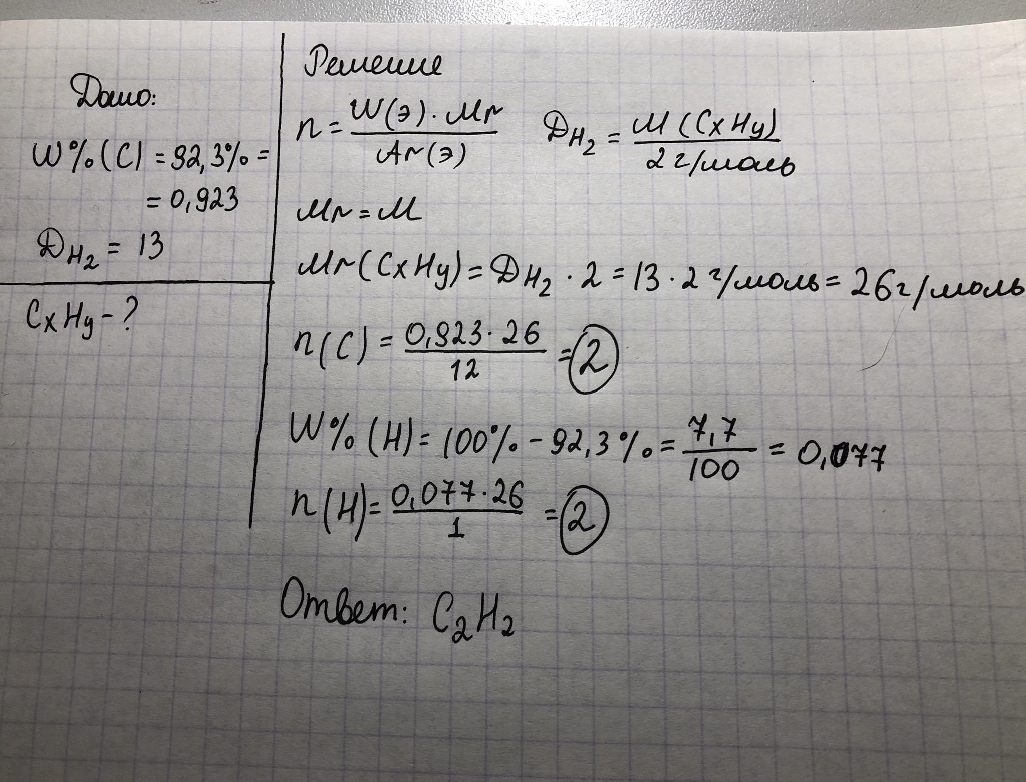 СРОЧНО ХИМИЯ 70Б, Вычислите молекулярную формулу углеводорода, если массовая доля углерода = 92,3% , относительная плотность данного вещества по водароду = 13