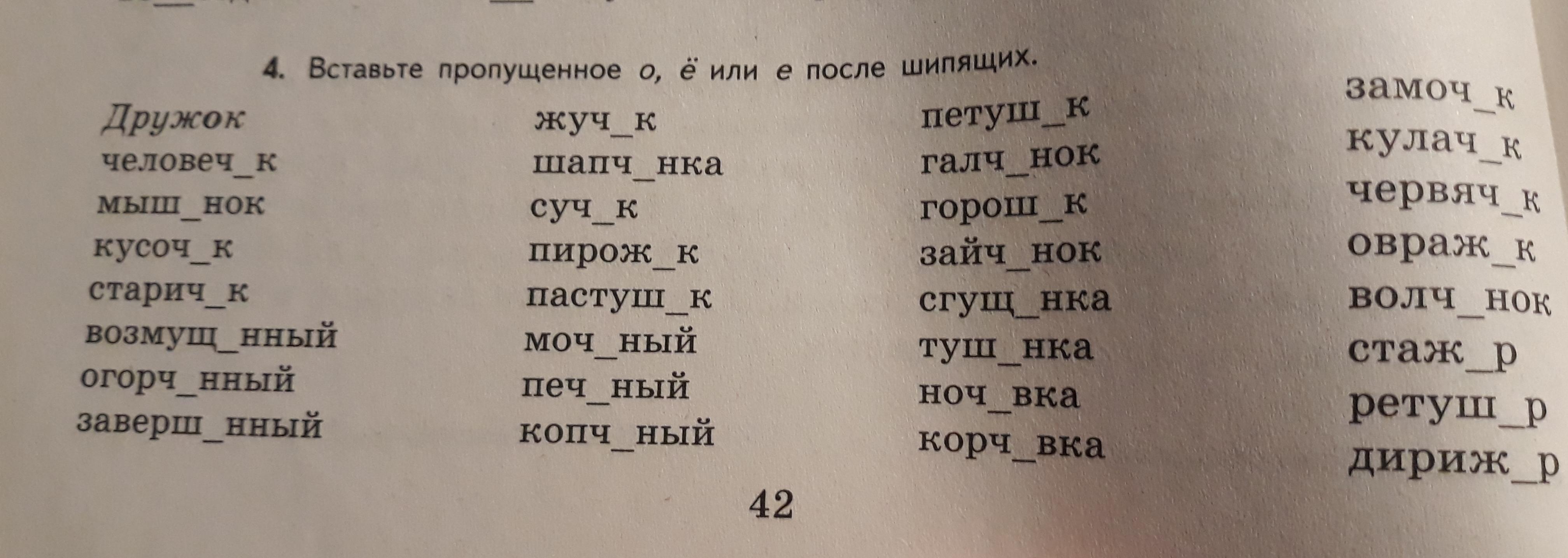 Человечек, мышонок, кусочек, старичок, возмущённый, огорчённый, завершённый, жучок, шапчёнка, сучок, пирожок, пастушок, мочёный, печёный, копчёный, петушок, галчонок, горшок, зайчонок, сгущёнка, тушёнка, ночёвка, корчёвка, замочек, кулачок, червячок, овражек, волчонок, стажёр, ретушёр, дирижёр.